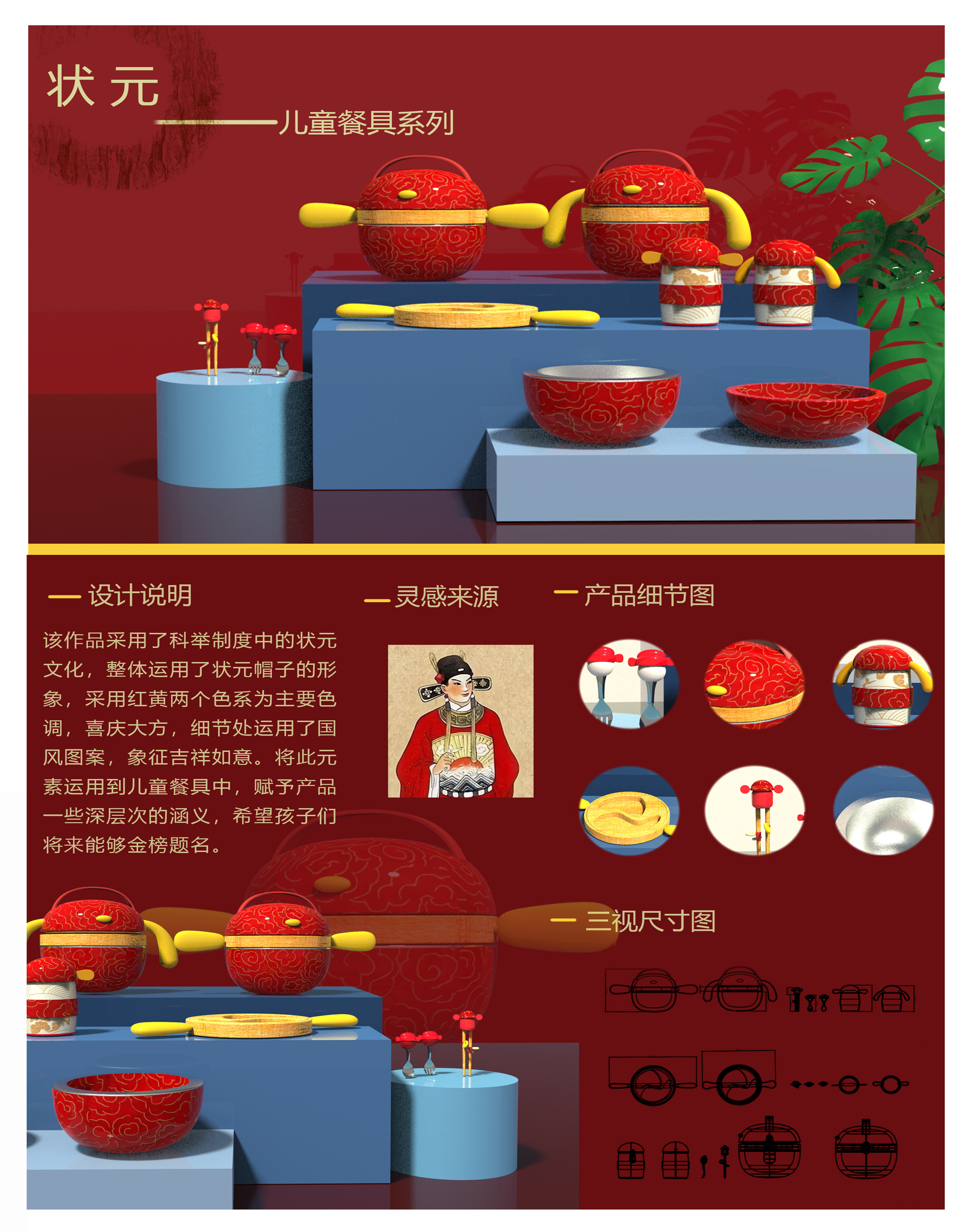 该作品采用了科举制度中的状元文化,整体运用了状元帽子的形象,采用红,黄两个色系为主要色调,喜庆大方,细节处运用了国风图案,象征吉祥如意将此元素运用到儿童餐具中,赋予产品一些深层次的含义,希望孩子们将来都能够金榜题名。