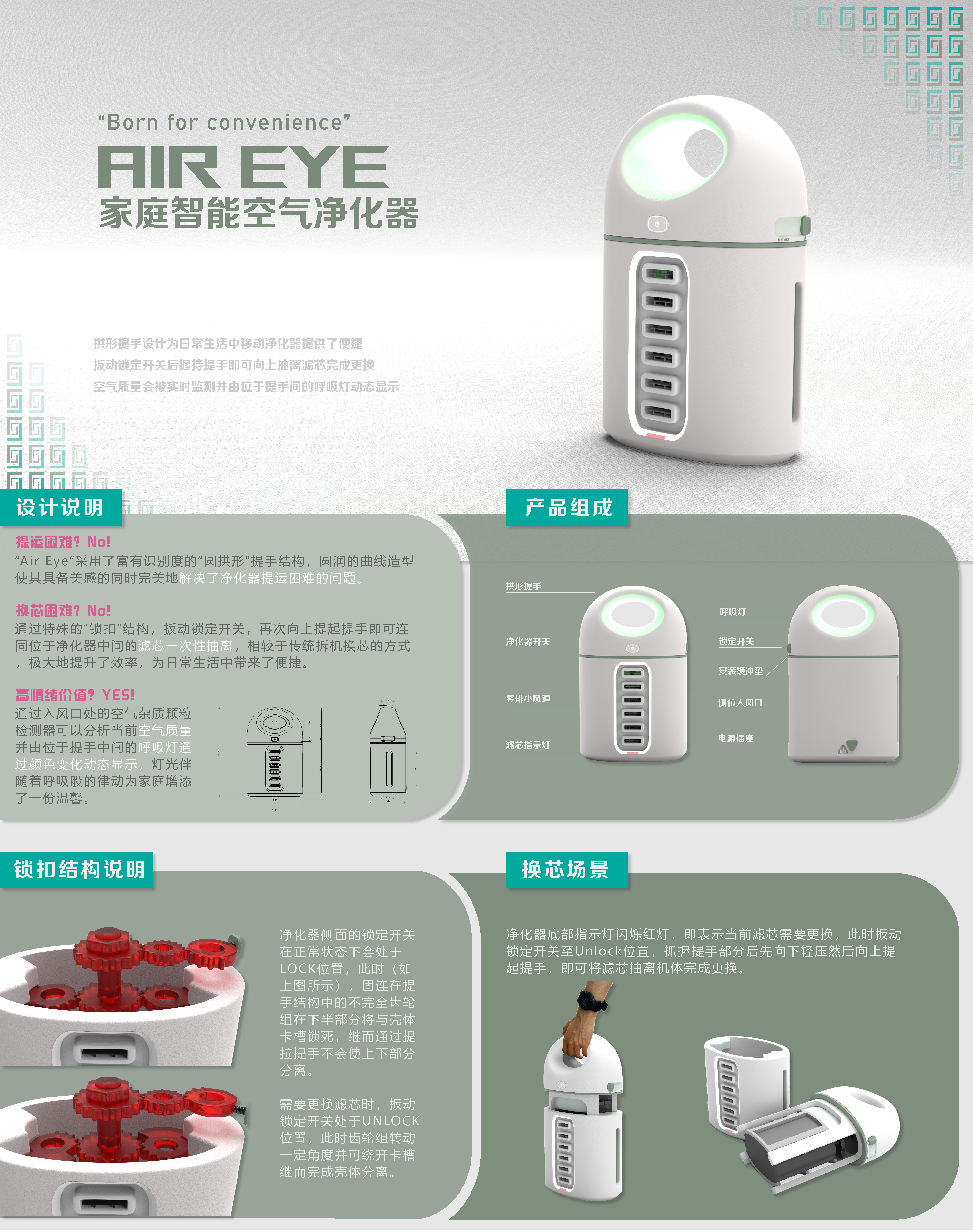 “Air Eye”采用了富有识别度的“圆拱形”提手结构,圆润的曲线造型使其具备美感的同时完美地解决了净化器提运困难的问题。 通过特殊的“锁扣”结构,扳动锁定开关,再次向上提起提手即可连同位于净化器中间的滤芯一次性抽离,相较于传统拆机换芯的方式,极大地提升了效率,为日常生活中带来了便捷。 通过呼吸灯的颜色变化动态显示空气质量的方式,让工业产品不再那么冷冰,为家庭带来了额外的温馨。