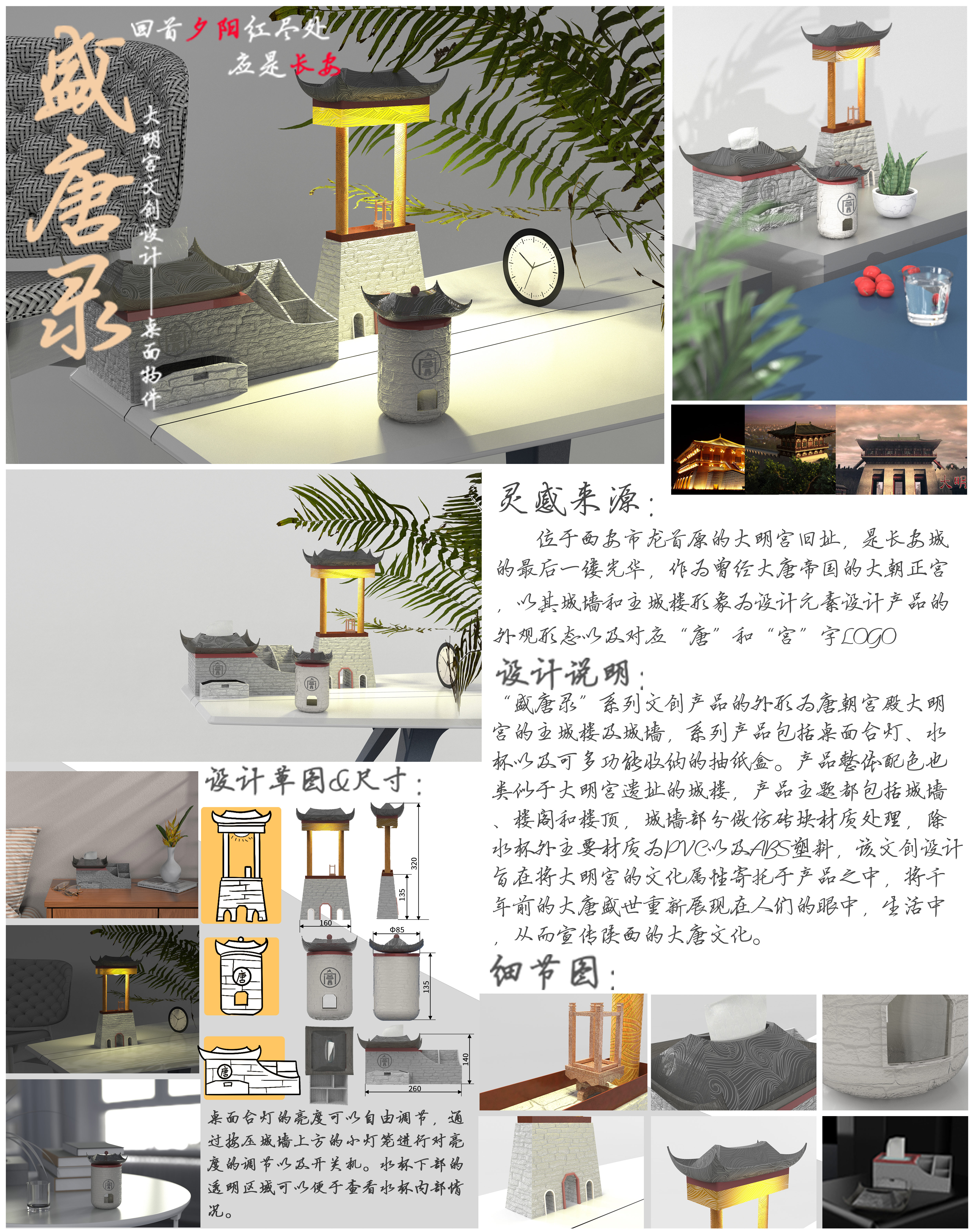 “盛唐录”系列文创产品外形为唐朝宫殿大明宫的主城楼和城墙,系列产品包括台灯、水杯以及可多功能收纳的抽纸盒。产品整体配色也参考了西安龙首原大明宫遗址的城楼,产品的主体都包括了城墙、楼阁和楼顶。城墙部分做仿砖块材质处理,除饮水杯外主要材质皆为PVC以及ABS塑料。该文创设计旨在将大明宫的文化属性寄托于产品之中,将千年前的大唐盛世重新展现在人们的眼前、生活中,从而宣传陕西的千古大唐文化。