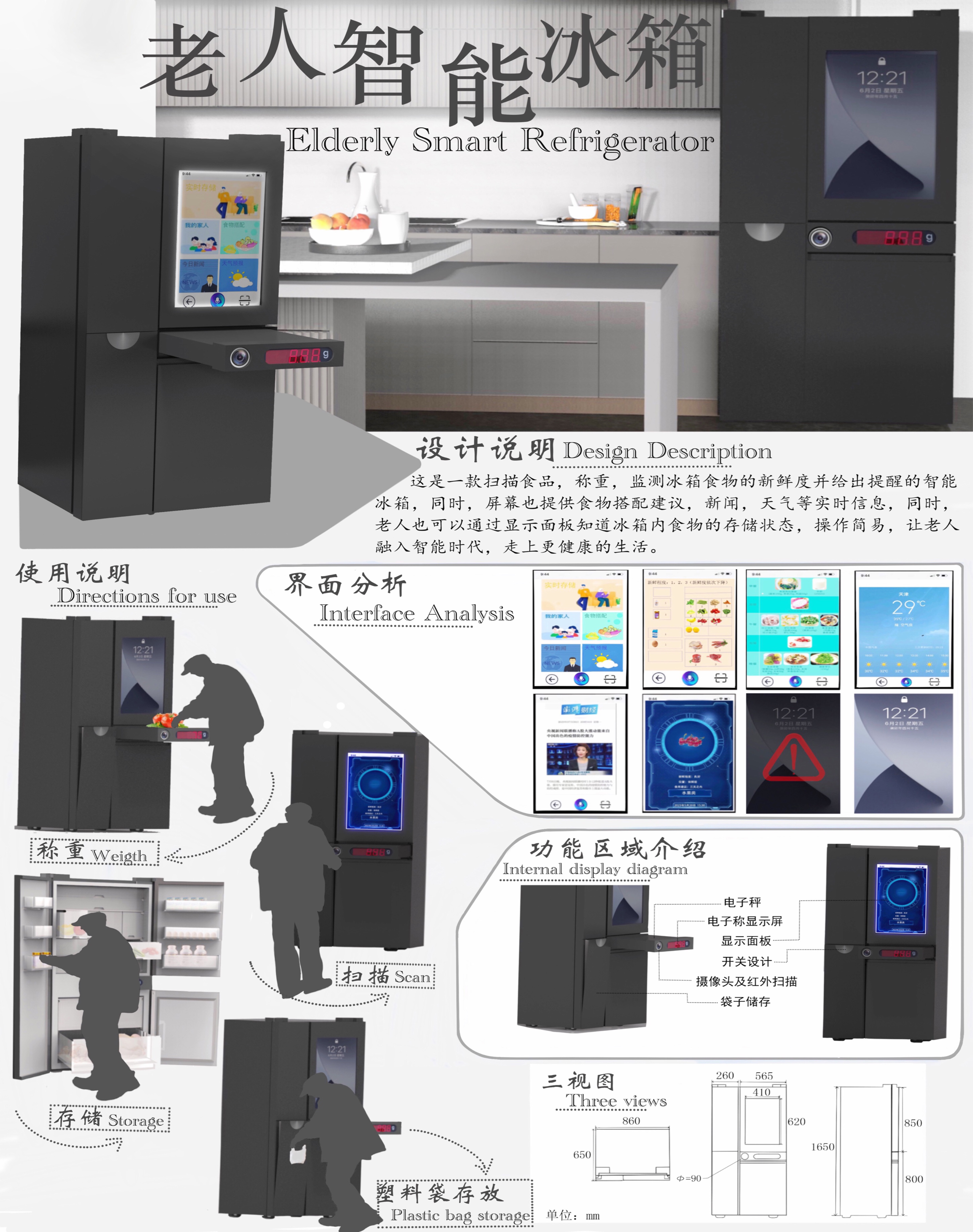 这是一款扫描食品品,称重,监测冰箱食物的新鲜度并给出提醒的智能冰箱,同时,屏幕也提供食物搭配建议,新闻,天气等实时信息,并且,老人也可以通过显示面板知道冰箱内食物的存储状态,操作简易,让老人融入智能时代,走上更健康的生活。