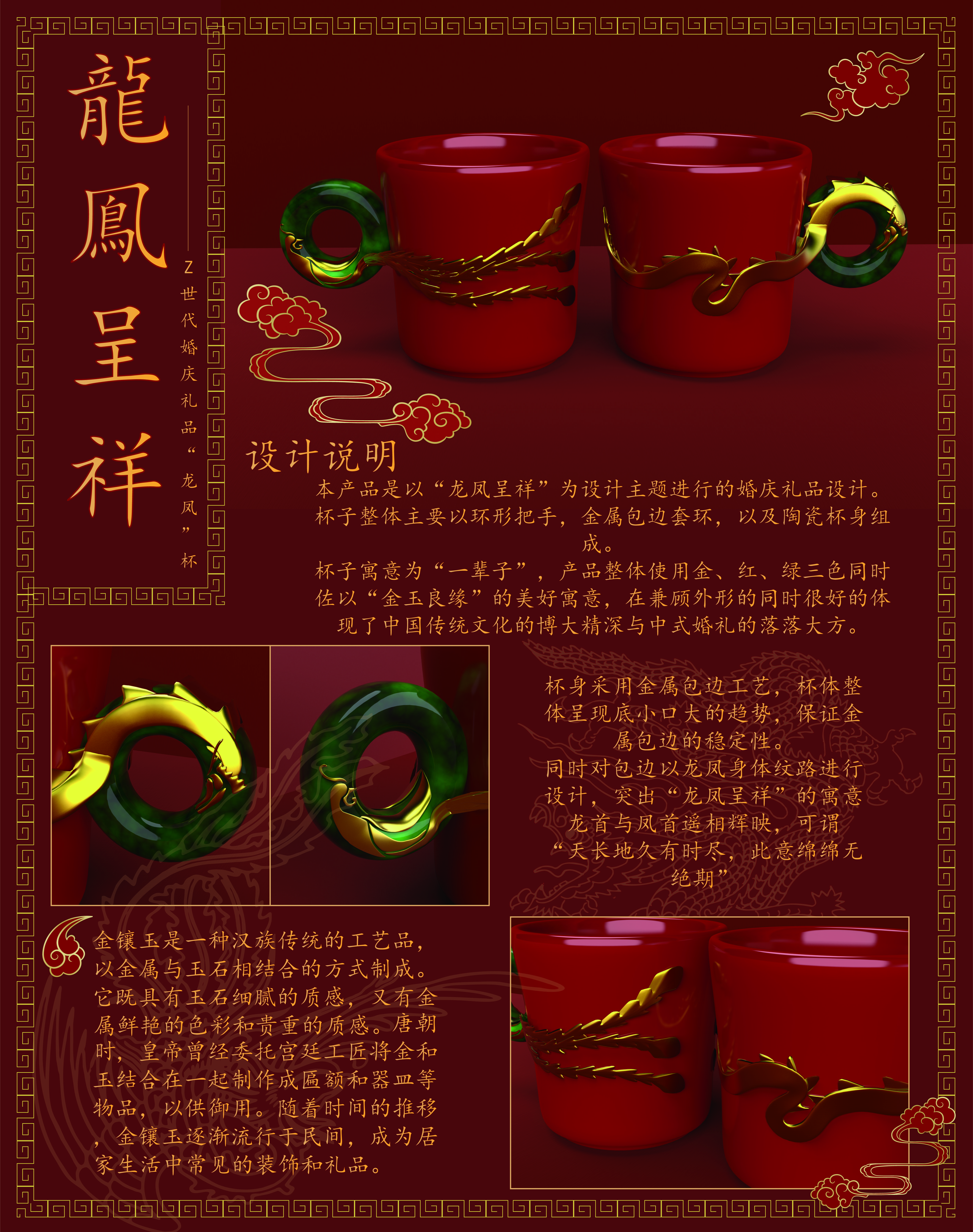 本产品是以“龙凤呈祥”为设计主题进行的婚庆产品设计。杯子整体主要以环形把手,金属包边以及陶瓷杯身组成。杯子在婚礼中寓意为“一辈子”,产品整体使用金红绿三色同时佐以“金玉良缘”的美好寓意,在兼顾外形的同时更好地体现了中华传统文化的博大精深和中式婚礼的落落大方