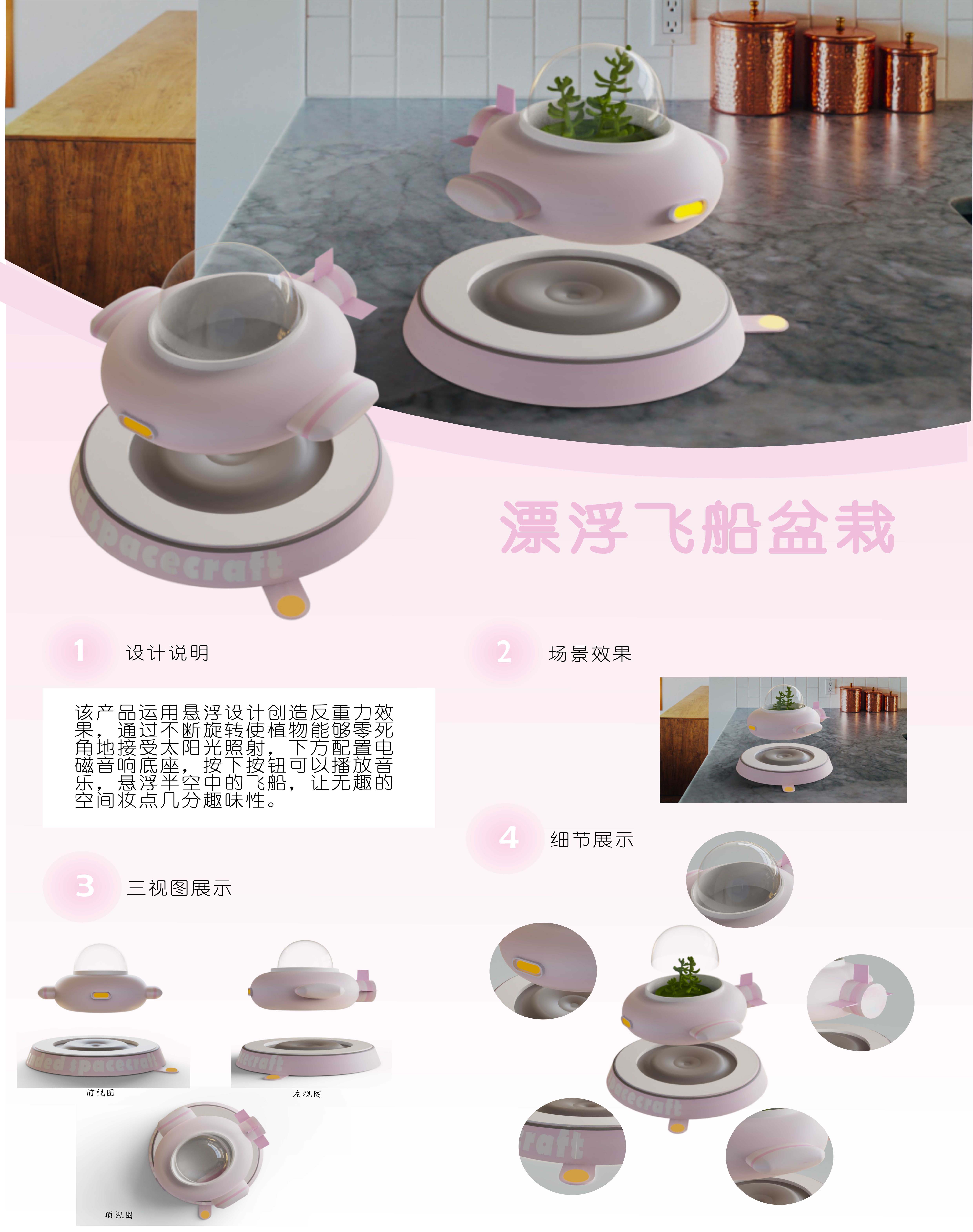该产品运用悬浮设计创造反重力效 果,通过不断旋转使植物能够零死 角地接受太阳光照射,下方配置电 磁音响底座,按下按钮可以播放音 乐,悬浮半空中的飞船,让无趣的 空间妆点几分趣味性。