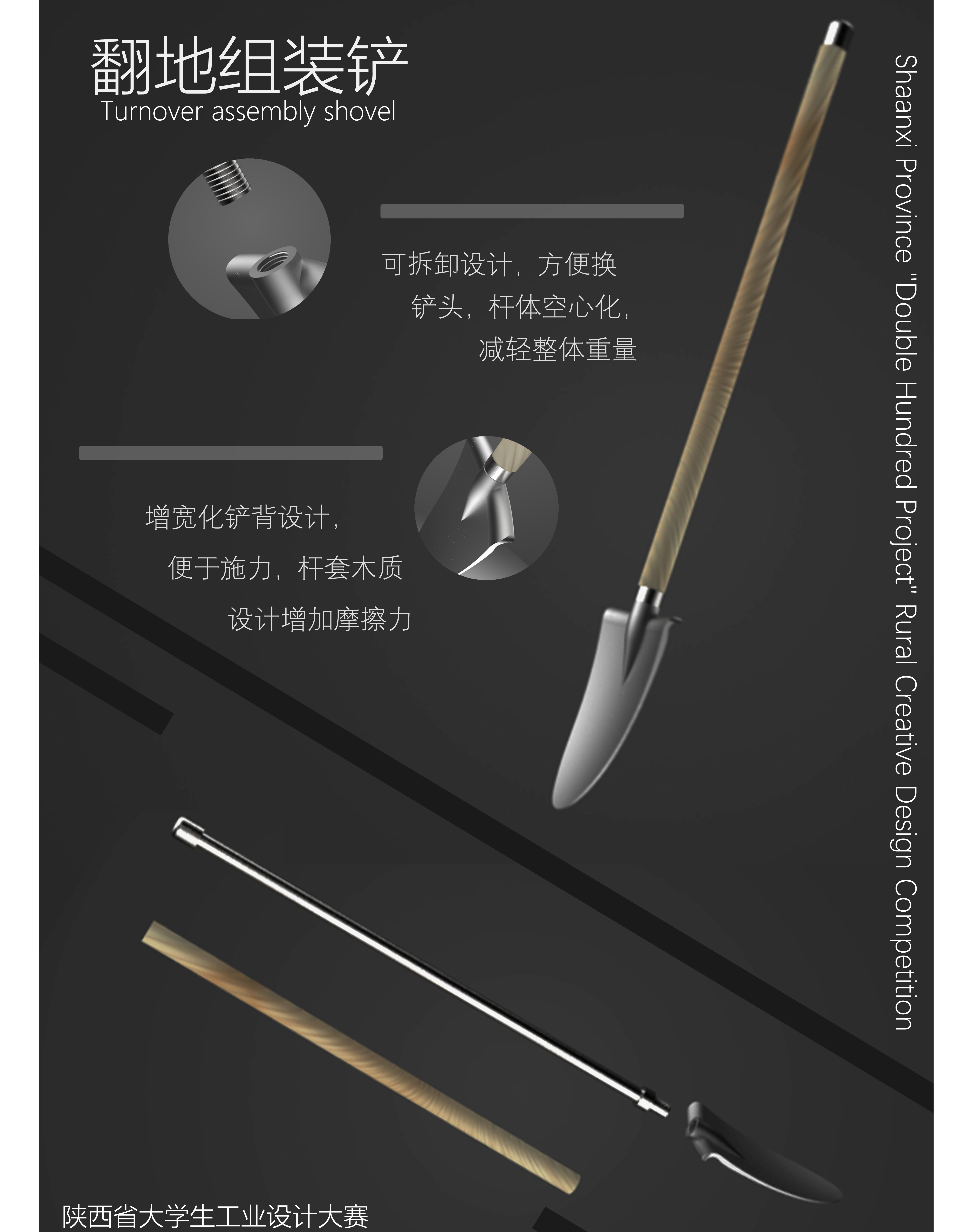 翻地组装铲,轻量化结构化设计,改善传统铁锹锄地锹头易脱落问题,且方便更换,杆柄中空设计,外有木质套柄减轻整体重量的同时,增加握持舒适度,同时铲锹背部增大受力面积,方便翻地时的主动施力,