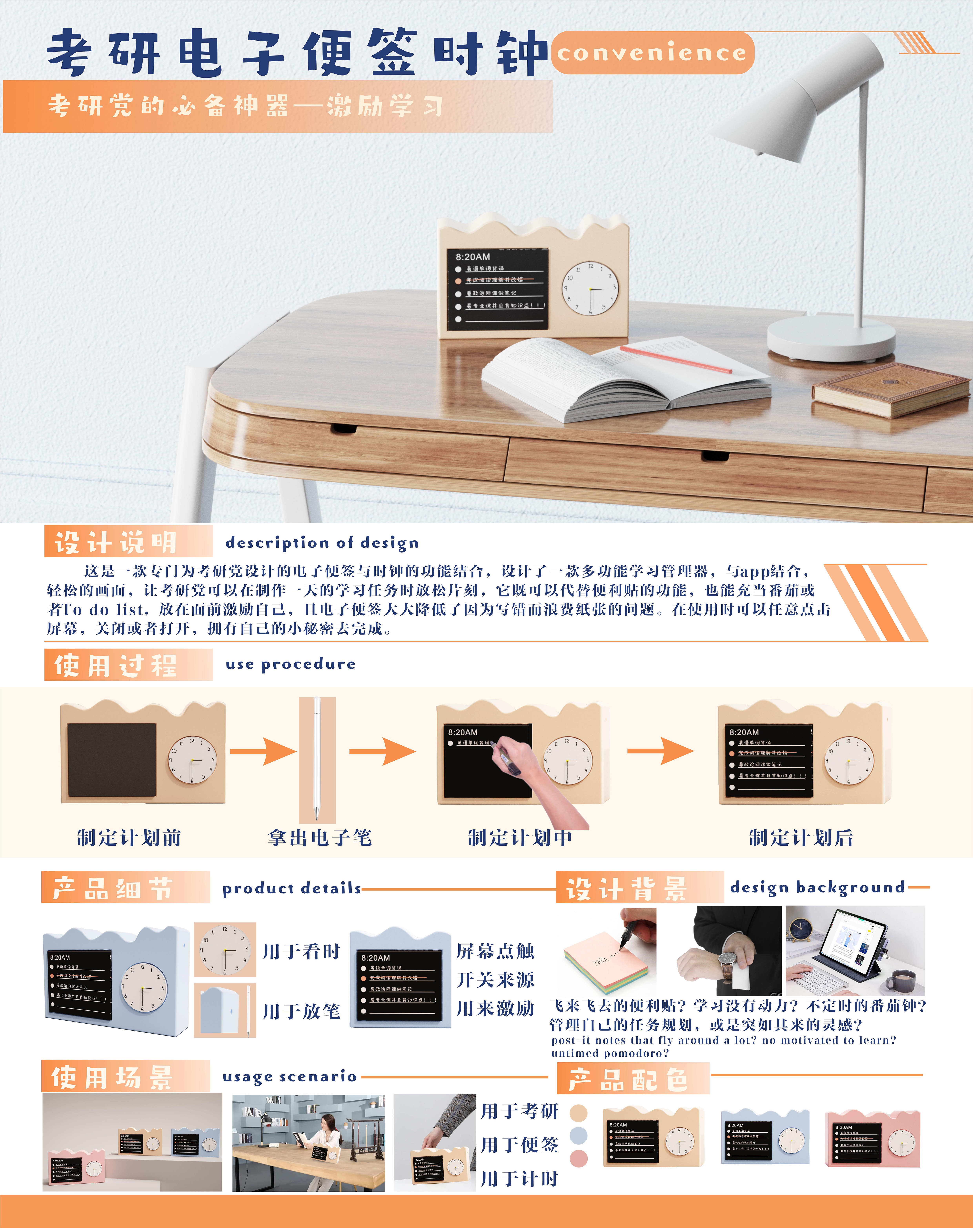 这是一款专门为考研党设计的电子便签与时钟的功能结合,设计了一款多功能学习管理器,与app结合,轻松的画面,让考研党可以在制作一天的学习任务时放松片刻,它既可以代替便利贴的功能,也能充当番茄或者To do list,放在面前激励自己,且电子便签大大降低了因为写错而浪费纸张的问题。在使用时可以任意点击屏幕,关闭或者打开,拥有自己的小秘密去完成。