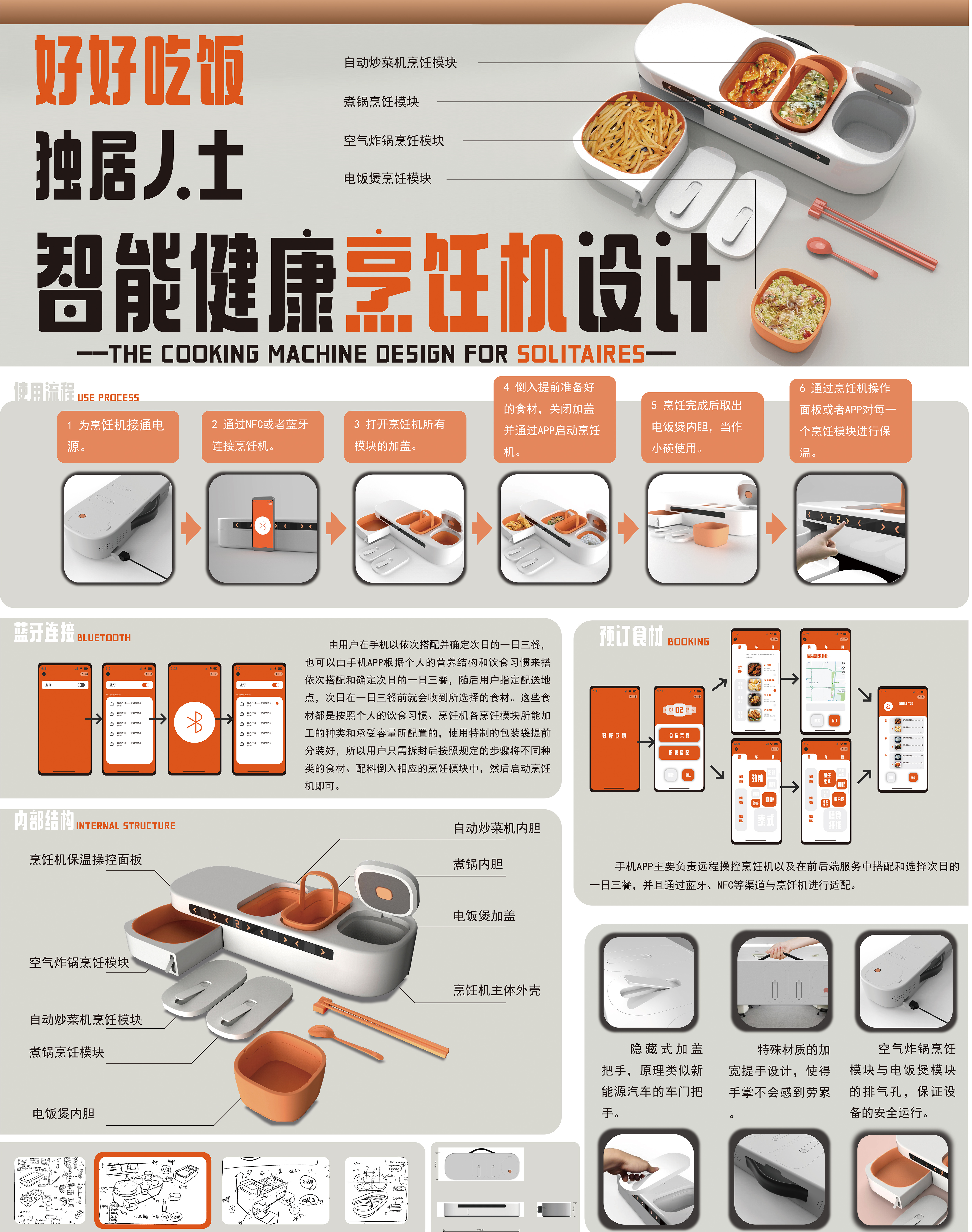 本产品以独居人士为对象,以好好吃饭为目的。其设计点是将多种烹饪方式集中在一台烹饪机上并可通过手机APP进行远程烹饪。烹饪机包含炸、炒、煮、蒸四个烹饪模块,各模块的容积符合“一人食”的份量。用户可通过APP来提前预约次日一日三餐的食材,也可根据个人的饮食结构来调整饮食计划或配置专门的菜单,由配送员准时配送到家。用户只需打开按键傻瓜操作即可,操作便携,原料到家,食物健康营养,达到好好吃饭的目的。
