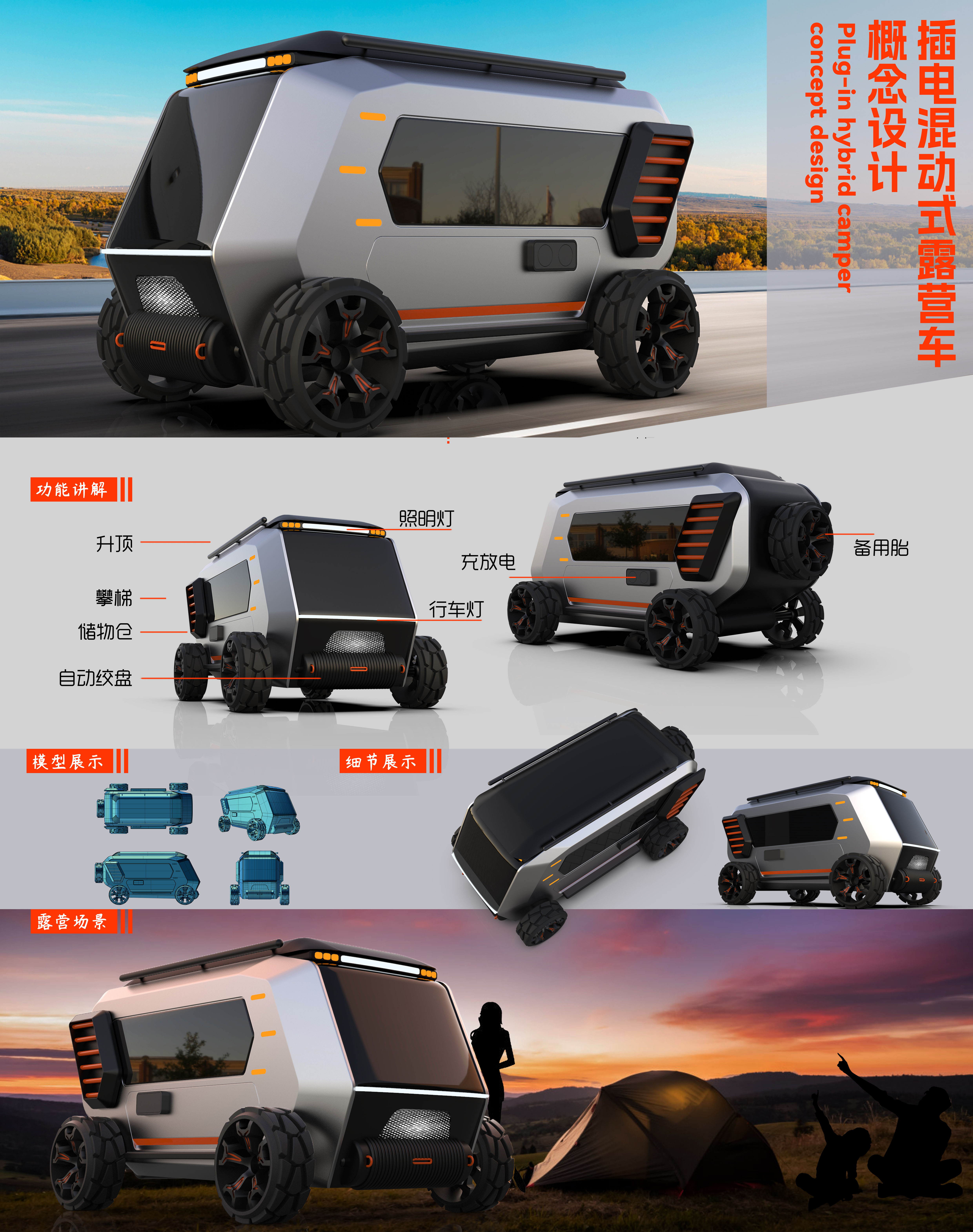 这款插电混动式露营车以 B 型旅居车为原型展开设计,采用了插电混动的动力方式,在保证续航前提下,在户外露营时能够更加方便地为用户提供电能。较高的离地间隙、较大的接近角和离去角,以及大尺寸的全地形轮胎,赋予了其良好的通过性,能够从容地面对各种崎岖路况。采用了升顶设计以增加车内使用空间,车身整体造型结构紧凑,大量的使用了较为硬朗的直线为设计元素,同时运用了穿插的造型方法,使车辆更具未来感。