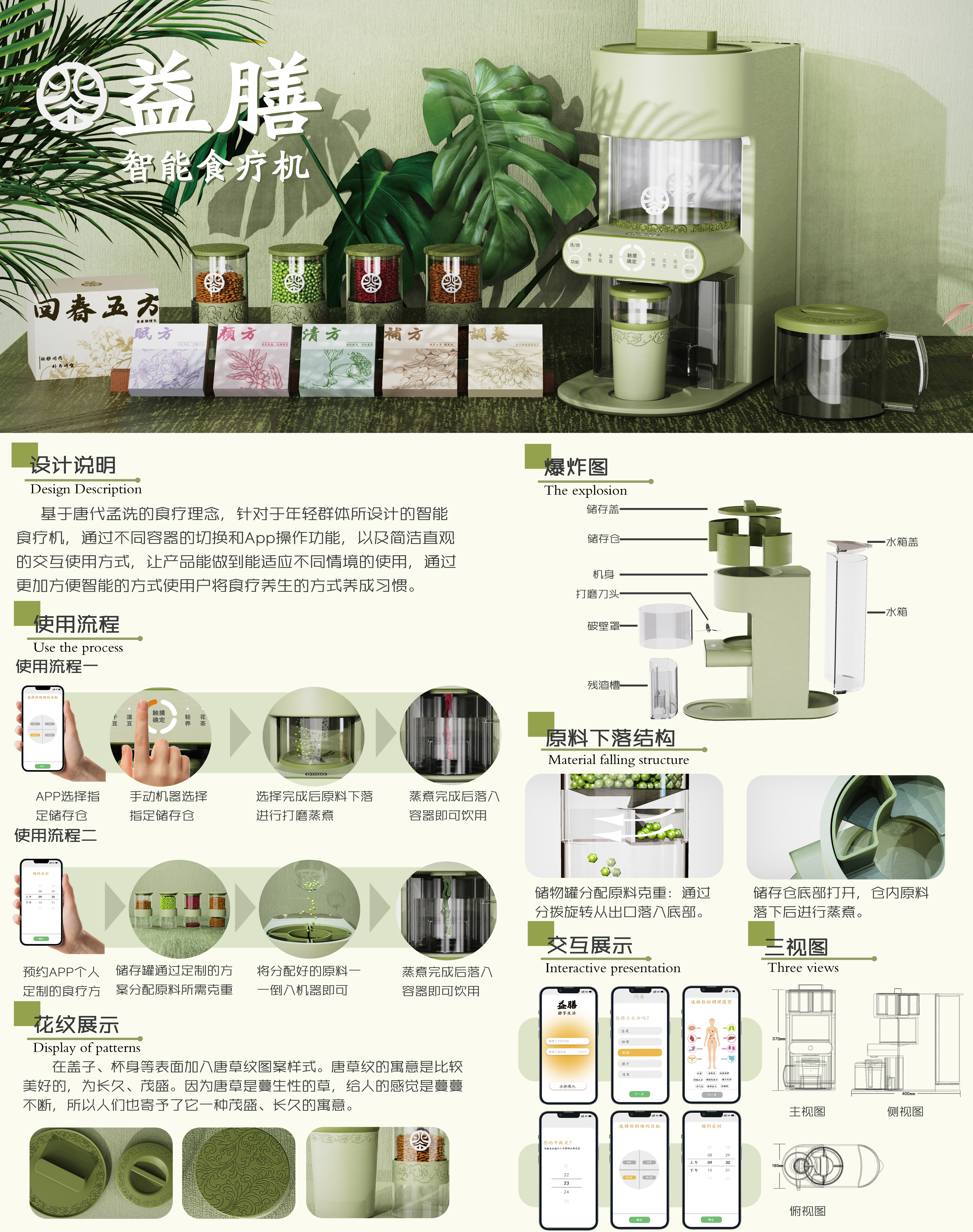 基于唐代孟诜的食疗理念,针对于年轻群体所设计的智能食疗机,通过不同容器的切换和App操作功能,以及简洁直观的交互使用方式,让产品能做到能适应不同情境的使用,通过更加方便智能的方式使用户将食疗养生的方式养成习惯。
