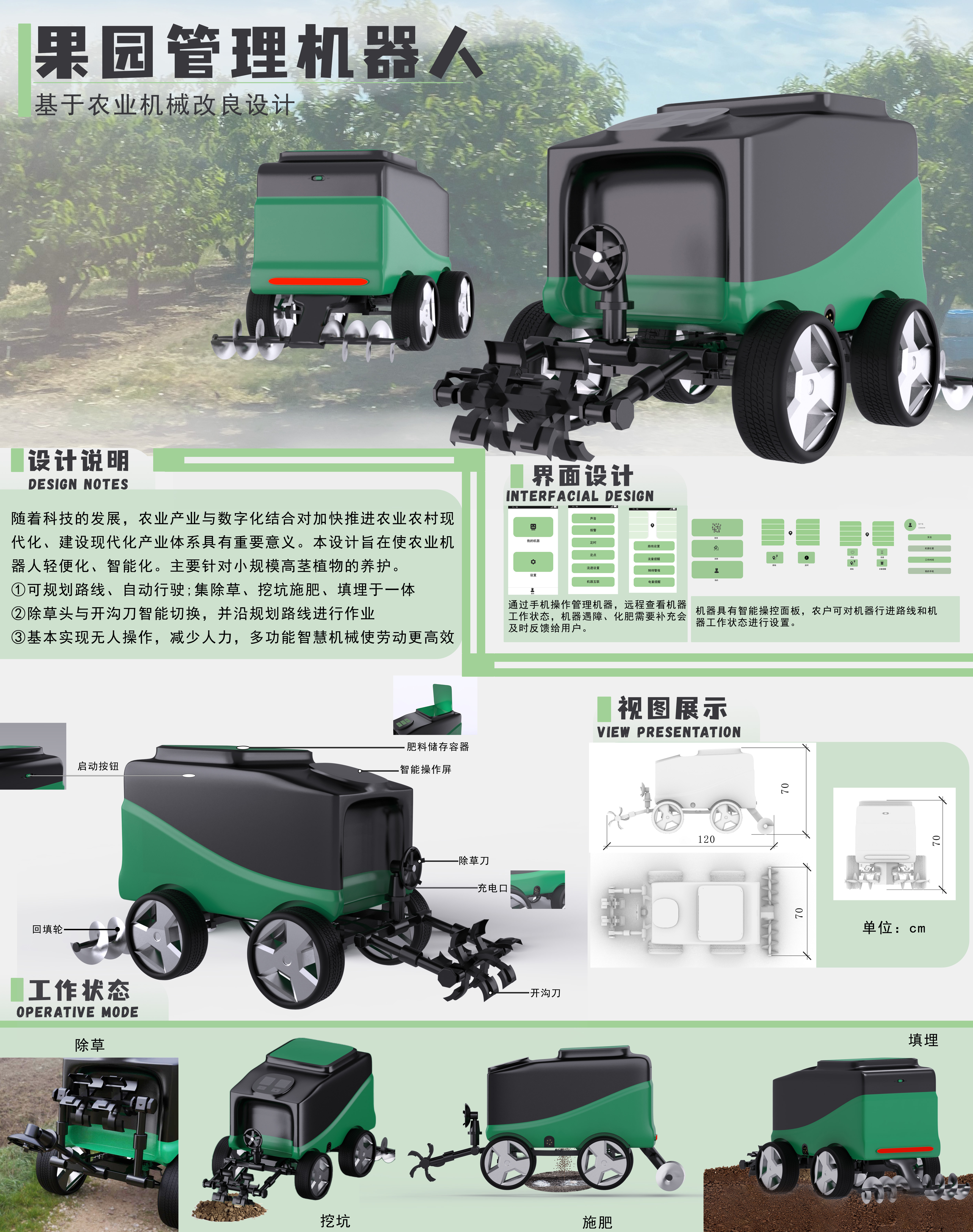 随着科技的发展,农业产业与数字化结合对加快推进农业农村现代化、建设现代化产业体系具有重要意义。本设计旨在使农业机器人轻便化、智能化。主要针对小规模高茎植物的养护。该产品: ①可规划路线、自动行驶;集除草、挖坑施肥、填埋于一体 ②除草头与开沟刀智能切换,并沿规划路线进行作业 ③基本实现无人操作,减少人力,多功能智慧机械使劳动更高效
