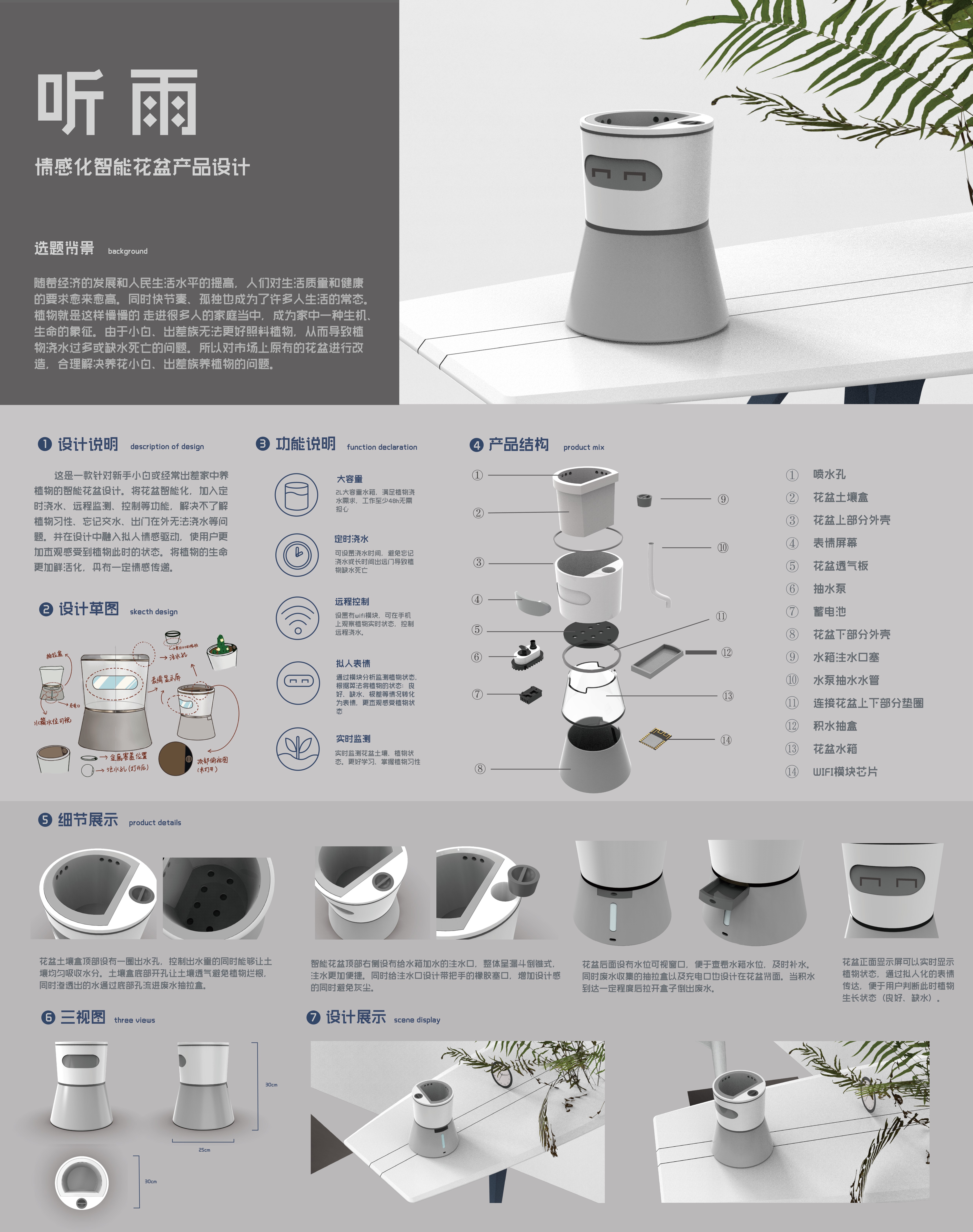 这是一款针对新手小白或经常出差家中养植物的智能情感化花盆设计。通过加入多种模块将花盆智能化,通过定时浇水、远程监测及控制等功能,解决不了解植物习性、忘记交水、出门在外无法浇水等问题。并在设计中融入拟人情感驱动,内置传感器通过分析将植物状态,将结果输出转化为表情通过花盆屏幕进行表达。使用户更加直观感受到植物此时的状态,将植物的生命更加鲜活化,具有一定的情感交互作用。