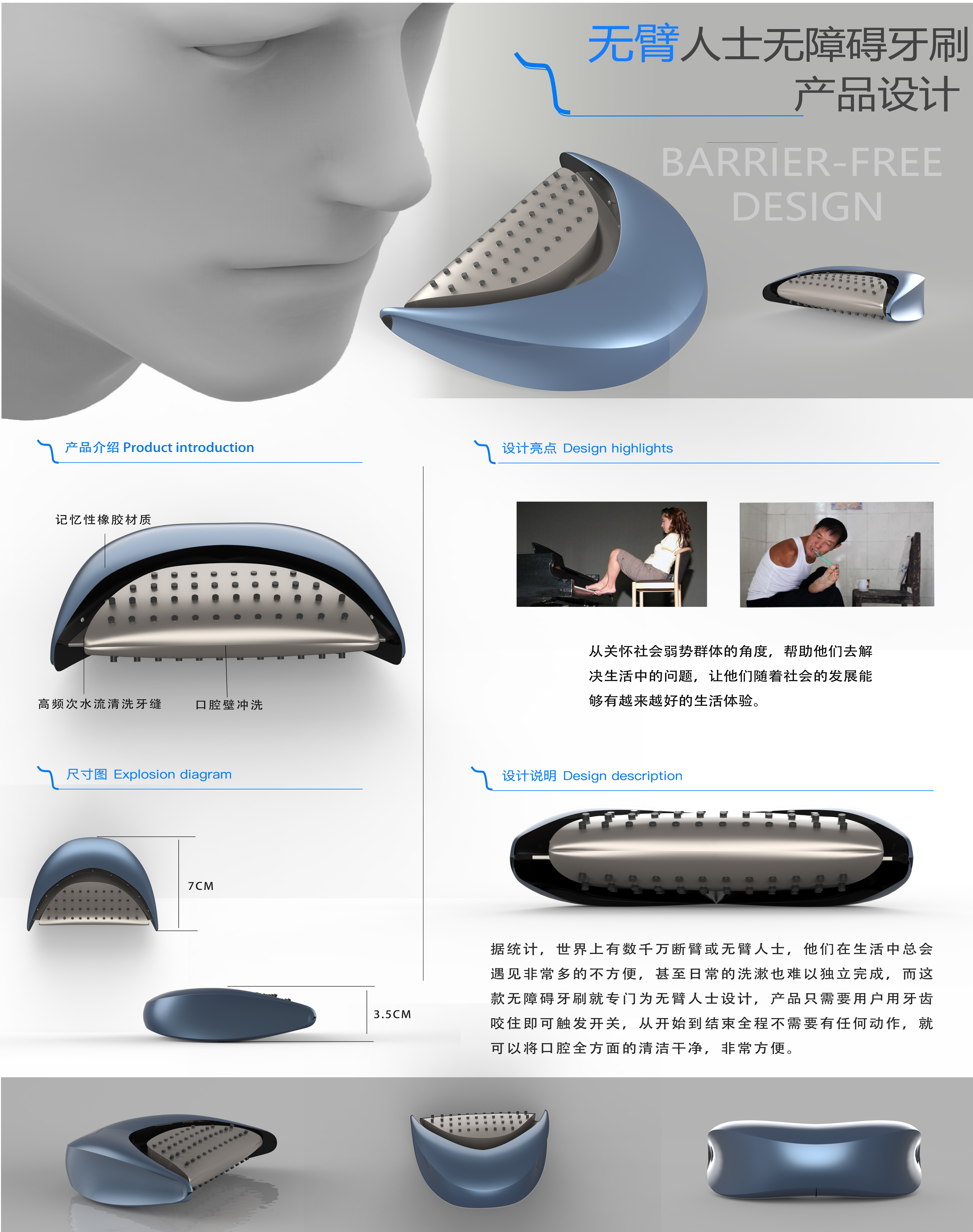 据统计,世界上有数千万断臂或无臂人士,他们在生活中总会遇见非常多的不方便,甚至日常的洗漱也难以独立完成,而这款无障碍牙刷就专门为无臂人士设计,产品只需要用户用牙齿咬住即可触发开关,从开始到结束全程不需要有任何动作,就可以将口腔全方面的清洁干净,非常方便。