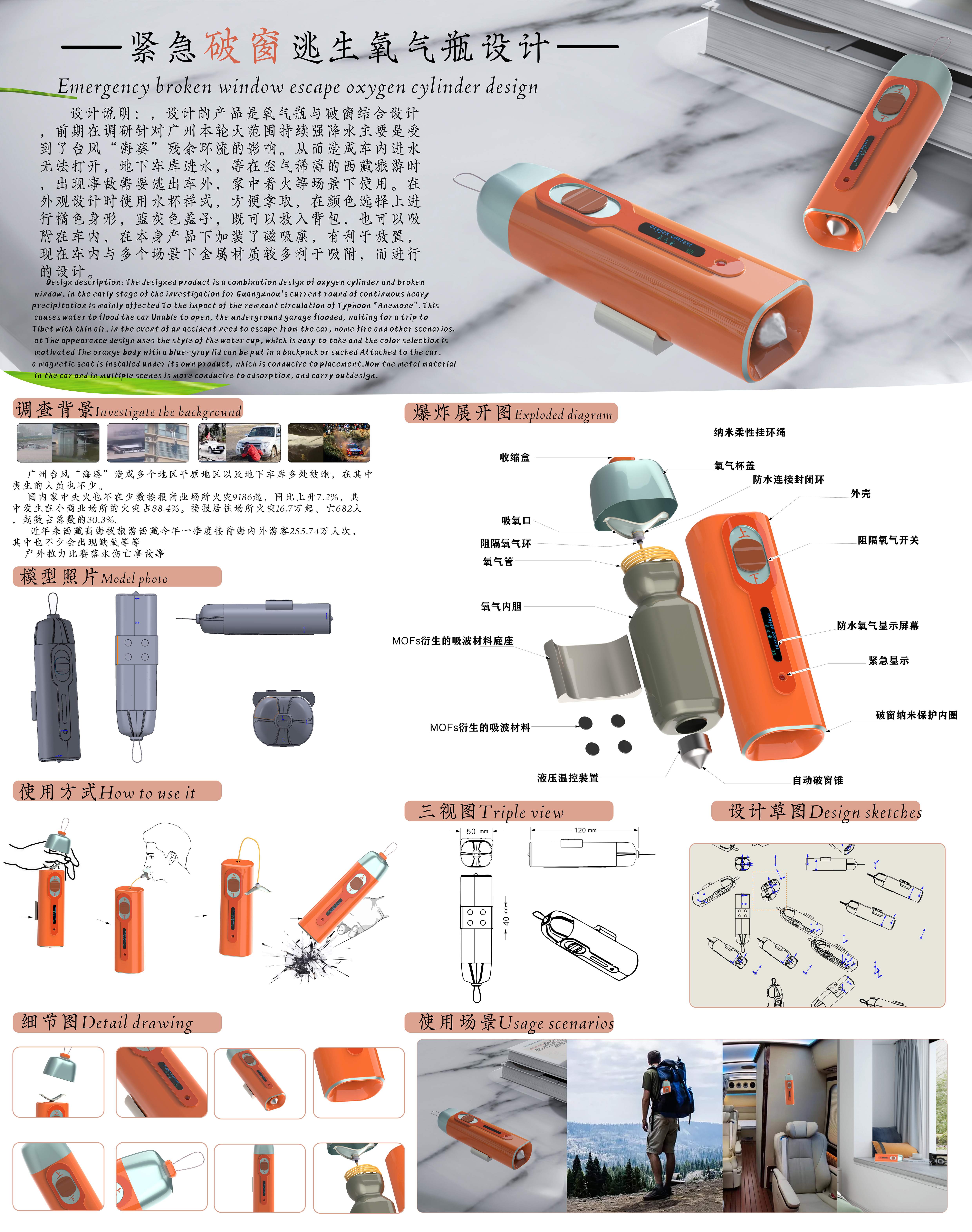 设计的产品是氧气瓶与破窗结合设计,前期在调研针对广州本轮大范围持续强降水主要是受到了台风“海葵”残余环流的影响。从而造成车内进水无法打开,地下车库进水,等在空气稀薄的西藏旅游时,出现事故需要逃出车外,家中着火等场景下使用。在外观设计时使用水杯样式,方便拿取,在颜色选择上进行橘色身形,蓝灰色盖子,既可以放入背包,也可以吸附在车内,在本身产品下加装了磁吸座,有利于放置。