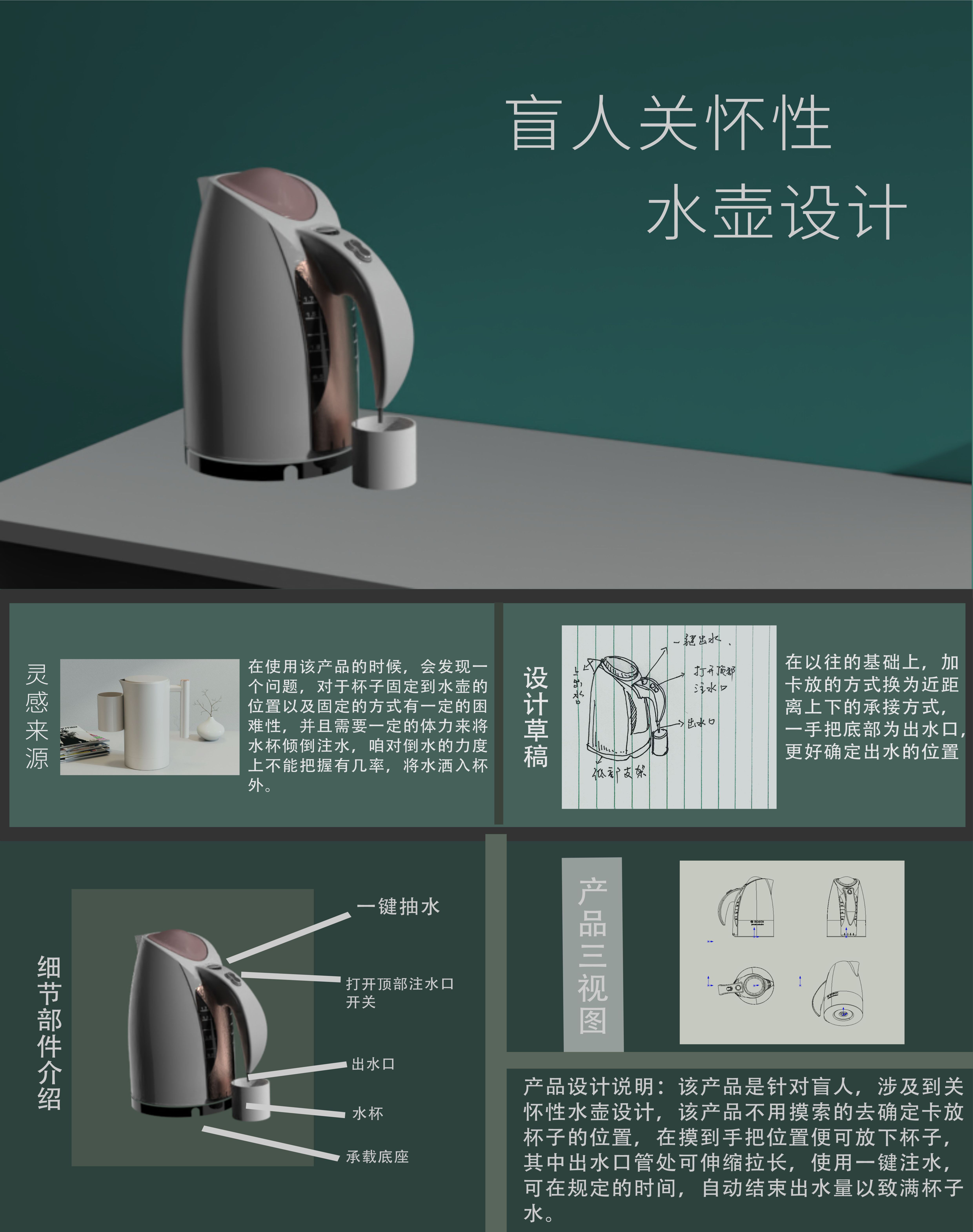 产品设计说明:该产品是针对盲人,涉及到关怀性水壶设计,该产品不用摸索的去确定卡放杯子的位置,在摸到手把位置便可放下杯子,其中出水口管处可伸缩拉长,使用一键注水,可在规定的时间,自动结束出水量以致满杯子水。