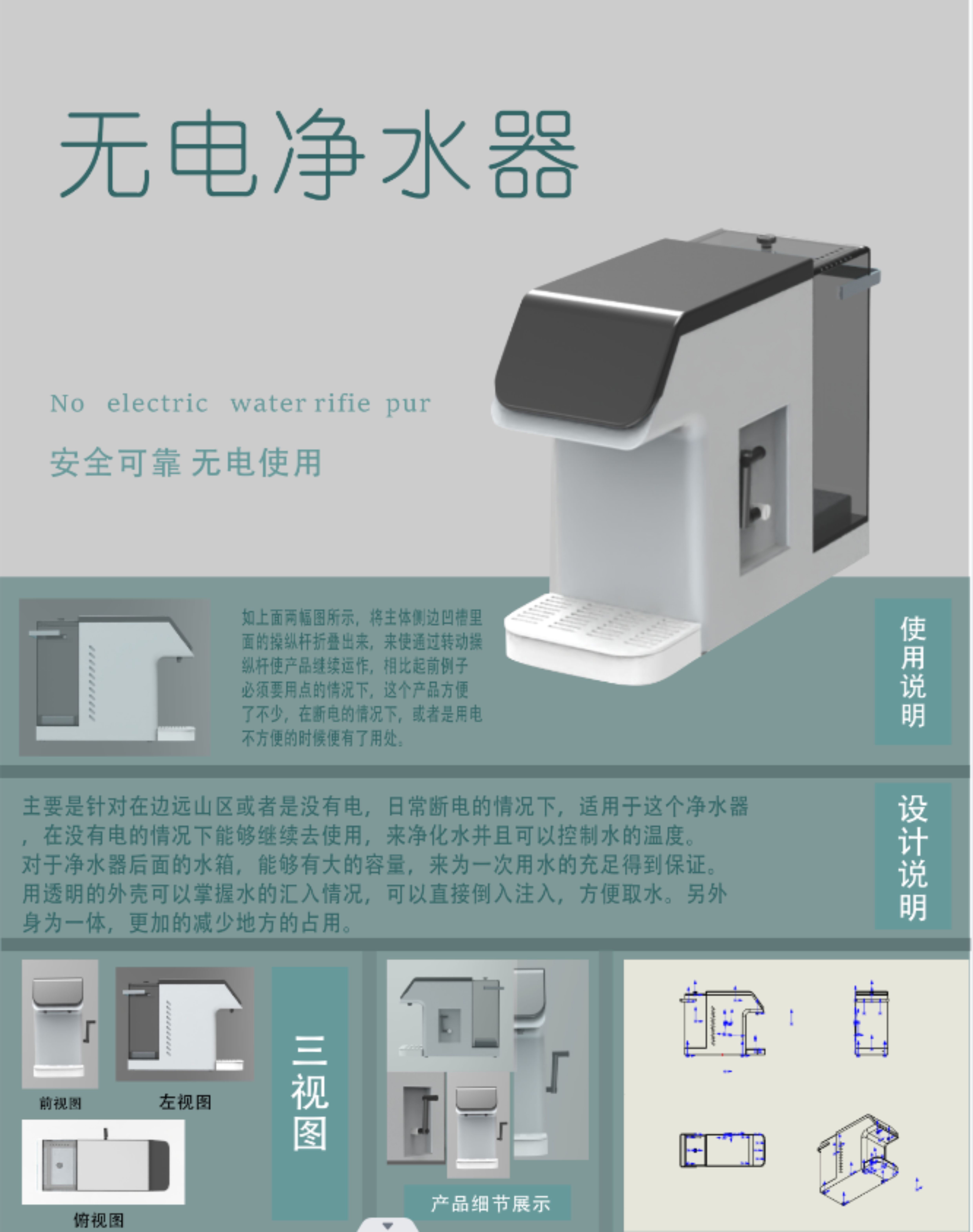 山区无电的情况下,山区水质不好,来进行无电的水质处理 运用压力的方式进行里面压力,使水流动来使水经过滤芯净化出水来后备箱有加水的过程,以致用水