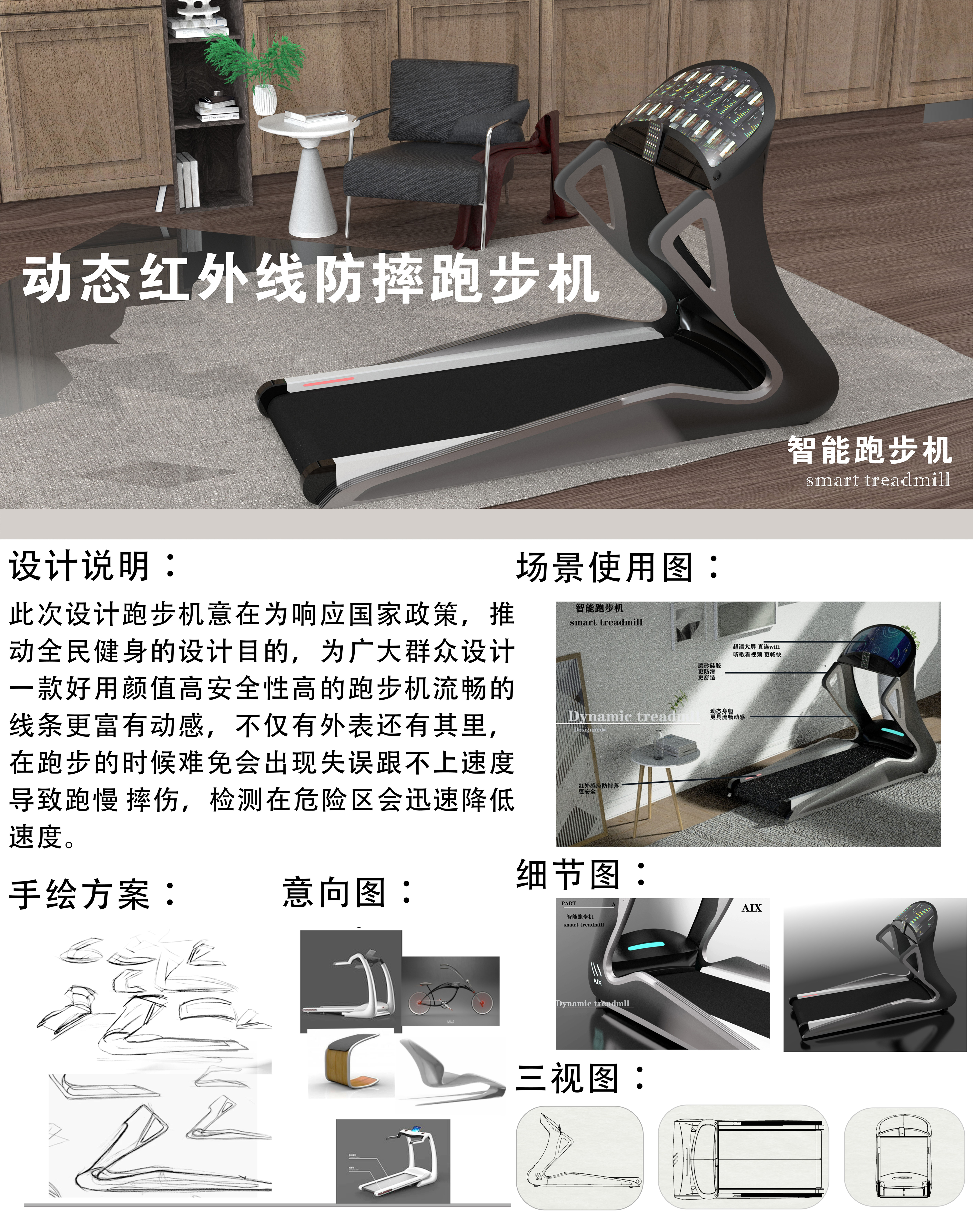 此次设计跑步机意在为响应国家政策,推动全民健身的设计目的,为广大群众设计一款好用颜值高安全性高的跑步机流畅的线条更富有动感,不仅有外表还有其里在跑步的时候难免会出现失误跟不上速度导致跑慢 摔伤,检测在危险区会迅速降低速度。