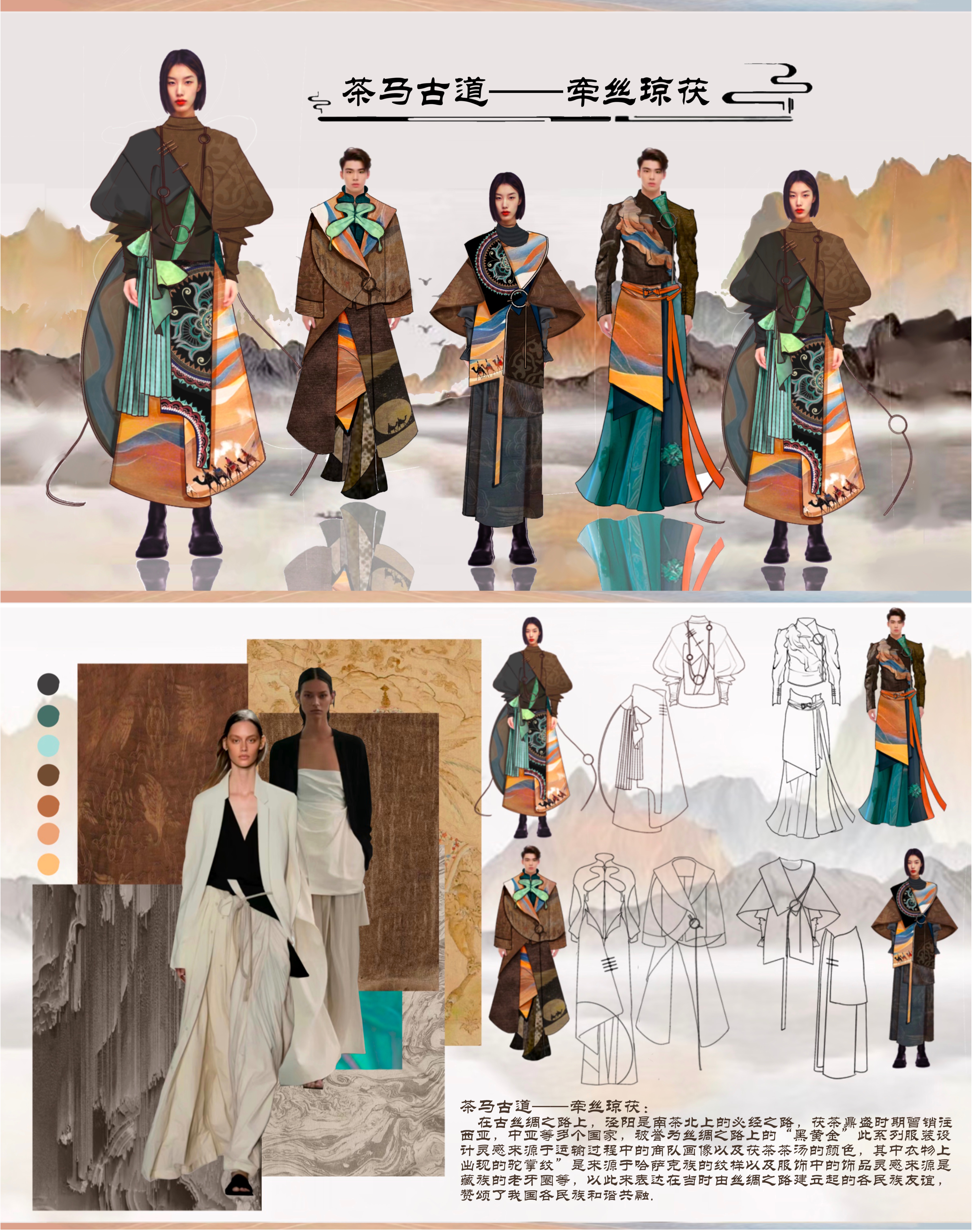 茶马古道——牵丝琼茯: 在古丝绸之路上,泾阳是南茶北上的必经之路,茯茶鼎盛时期曾销往西亚,中亚等多个国家,被誉为丝绸之路上 的“黑黄金”此系列服装设计灵感来源于运输过程中的商队画像以及茯茶茶汤的颜色,其中衣物上出现的 “驼掌纹”是来源于哈萨克族的纹样以及服饰中的饰品灵感来源是藏族的老牙圈等,以此来表达在当时由丝绸之 路建立起的各民族友谊,赞颂了我国各民族和谐共融