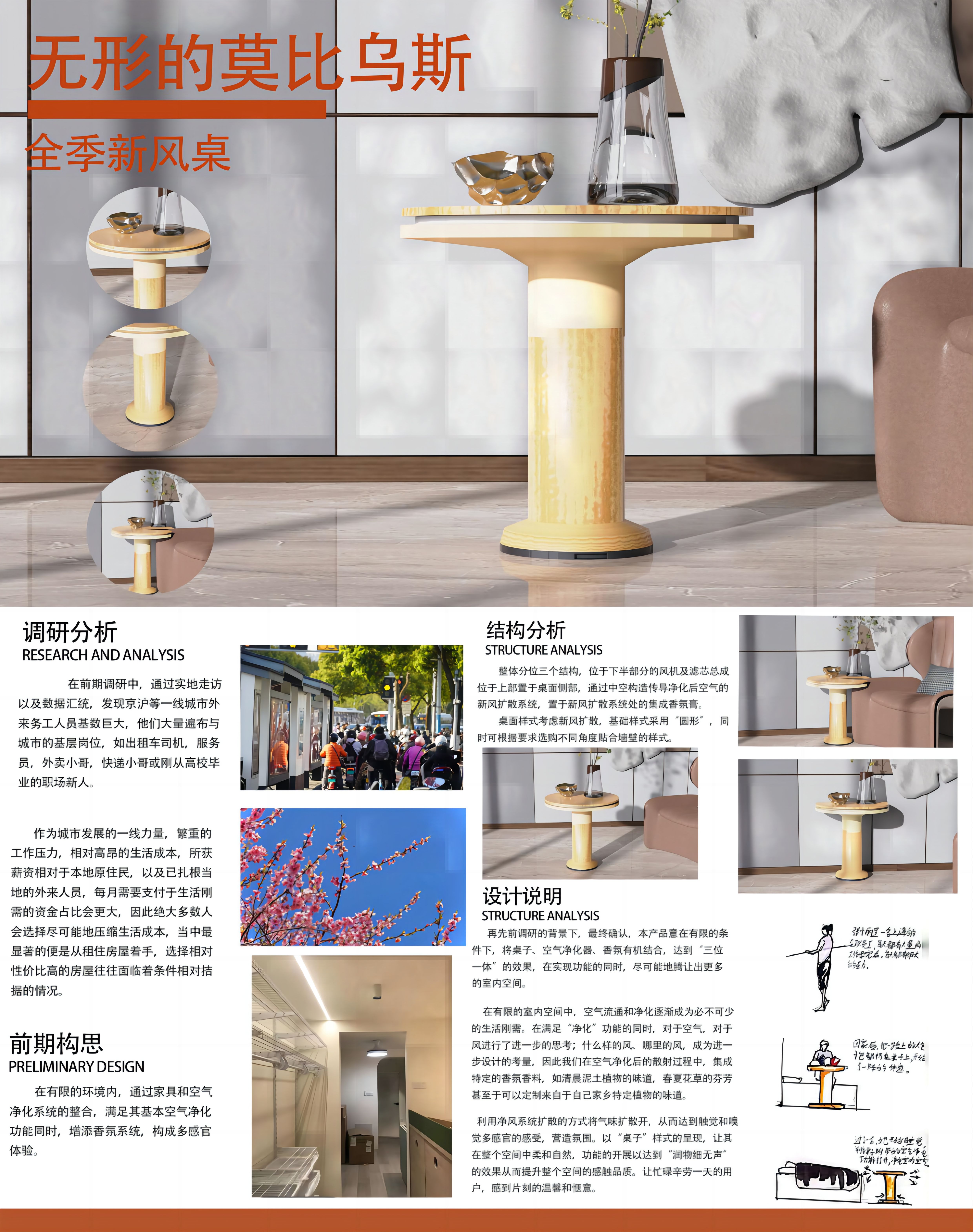 本产品意在有限的条件下,将桌子、空气净化器、香氛有机结合,达到“三位一体”的效果,在有限的室内空间中,空气流通和净化逐渐成为必不可少的生活刚需。在满足“净化”功能的同时,对于空气,风进行了进一步的思考;什么样的风、哪里的风,成为进一步设计的考量,因此我们在空气净化后的散射过程中,集成特定的香氛香料,如清晨泥土植物的味道,春夏花草的芬芳甚至于可以定制来自于自己家乡特定植物的味道。