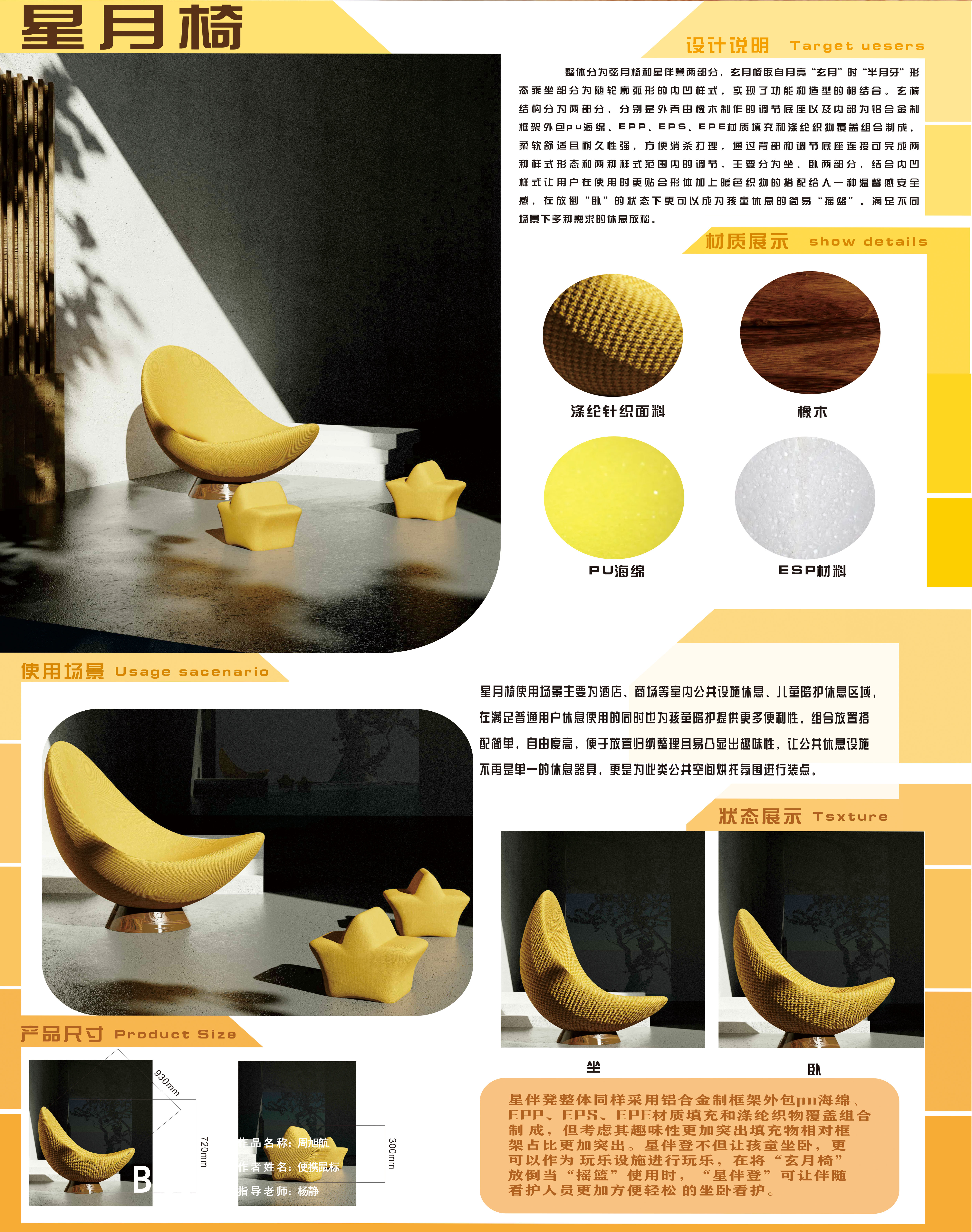 整体分为弦月椅和星伴凳两部分,玄月椅取自月亮“玄月”时“半月牙”形态乘坐部分为随轮廓弧形的内凹样式,实现了功能和造型的相结合。玄椅结构分为两部分,分别是外壳由橡木制作的调节底座以及内部为铝合金制框架外pu海绵、EPP、EPS、EPE材质填充和涤纶织物覆盖组合制成,柔软舒适且耐久性强,方便消杀打理,通过背部和调节底座连接可完成两种样式形态和两种样式范围内的调节满足不同场景下多种需求的休息放松。