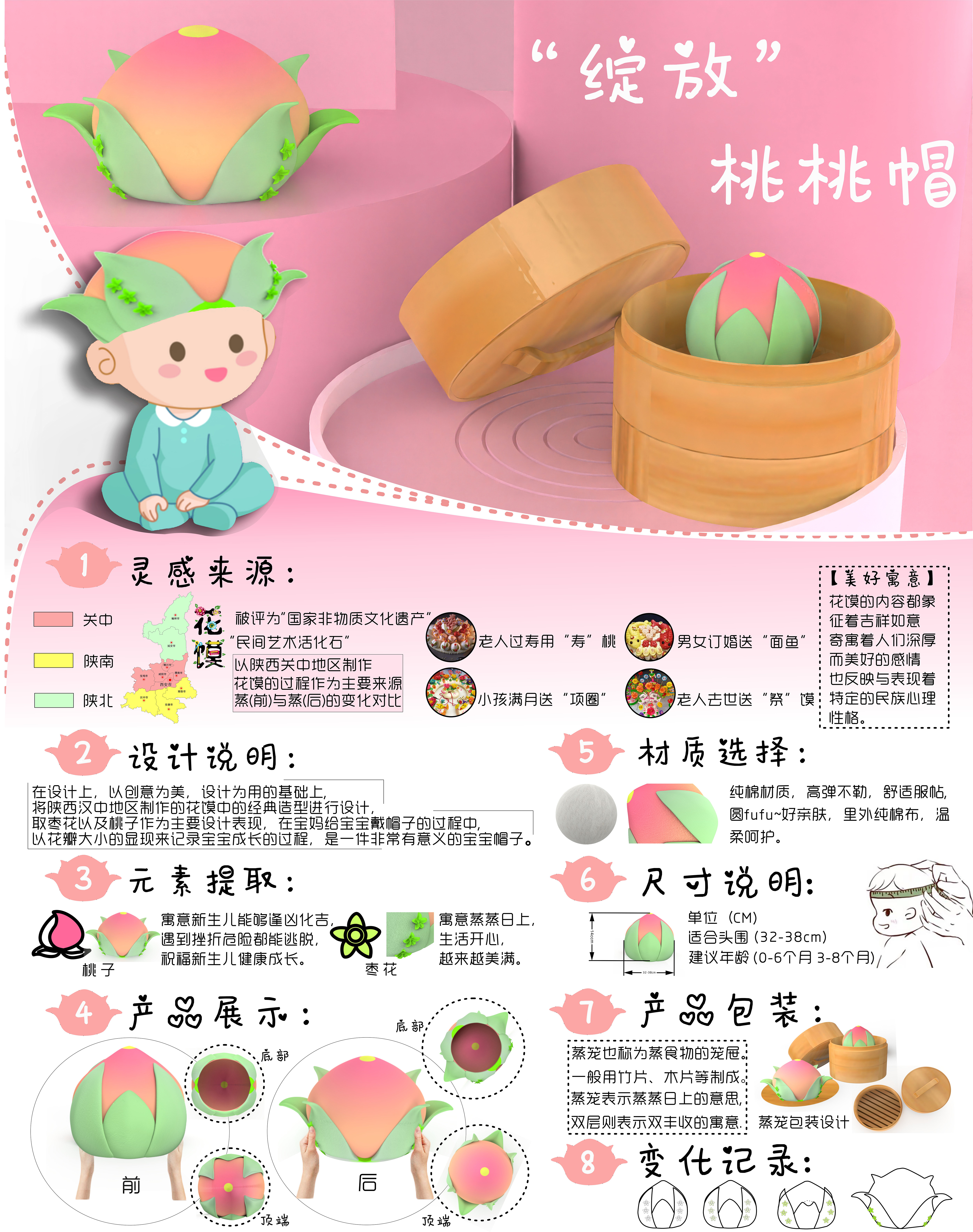 在设计上,以创意为美,设计为用的基础上,将陕西汉中地区制作的花馍中的经典造型进行设计,取枣花以及帽子作为主要设计表现,在宝妈给宝宝戴帽子的过程中,以花瓣的大小显现记录宝宝成长的过程,是一件非常有意义的宝宝帽子