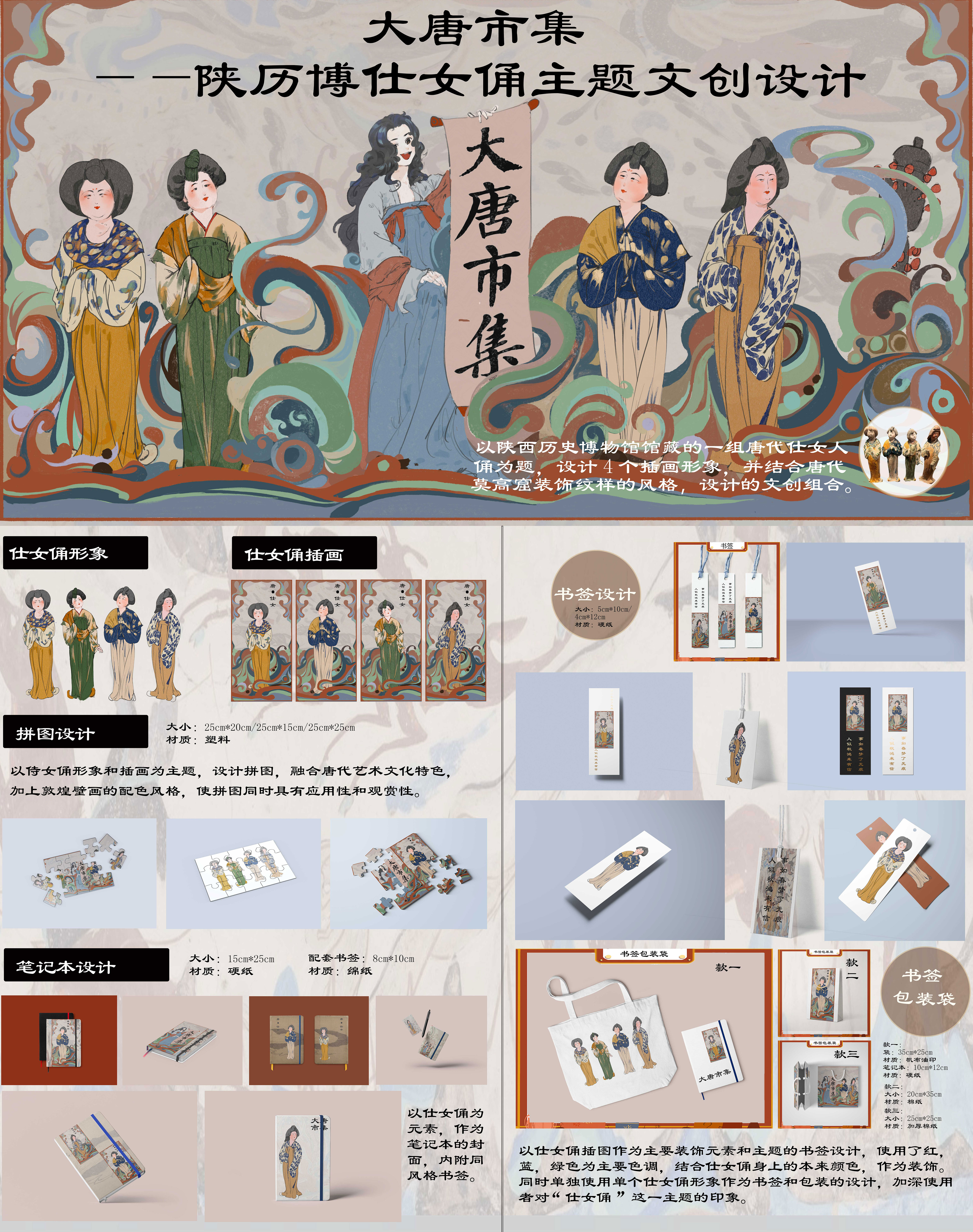 陕西历史博物馆的唐朝仕女俑乖巧可爱,丰满圆润,一经展出就获得了不少观众的喜爱。本次文创正是选用了陕历博的一组唐朝仕女俑作为设计主要元素,在“大唐市集”文创主题之下,以仕女俑插图作为主要装饰元素,使用了红,蓝,绿色为主要色调,同时借鉴了敦煌壁画的配色,设计了书签,书签包装,拼图和笔记本一系列文创。同时单独使用单个仕女俑形象作为书签和包装的设计,加深使用者对“仕女俑”这一主题的印象。