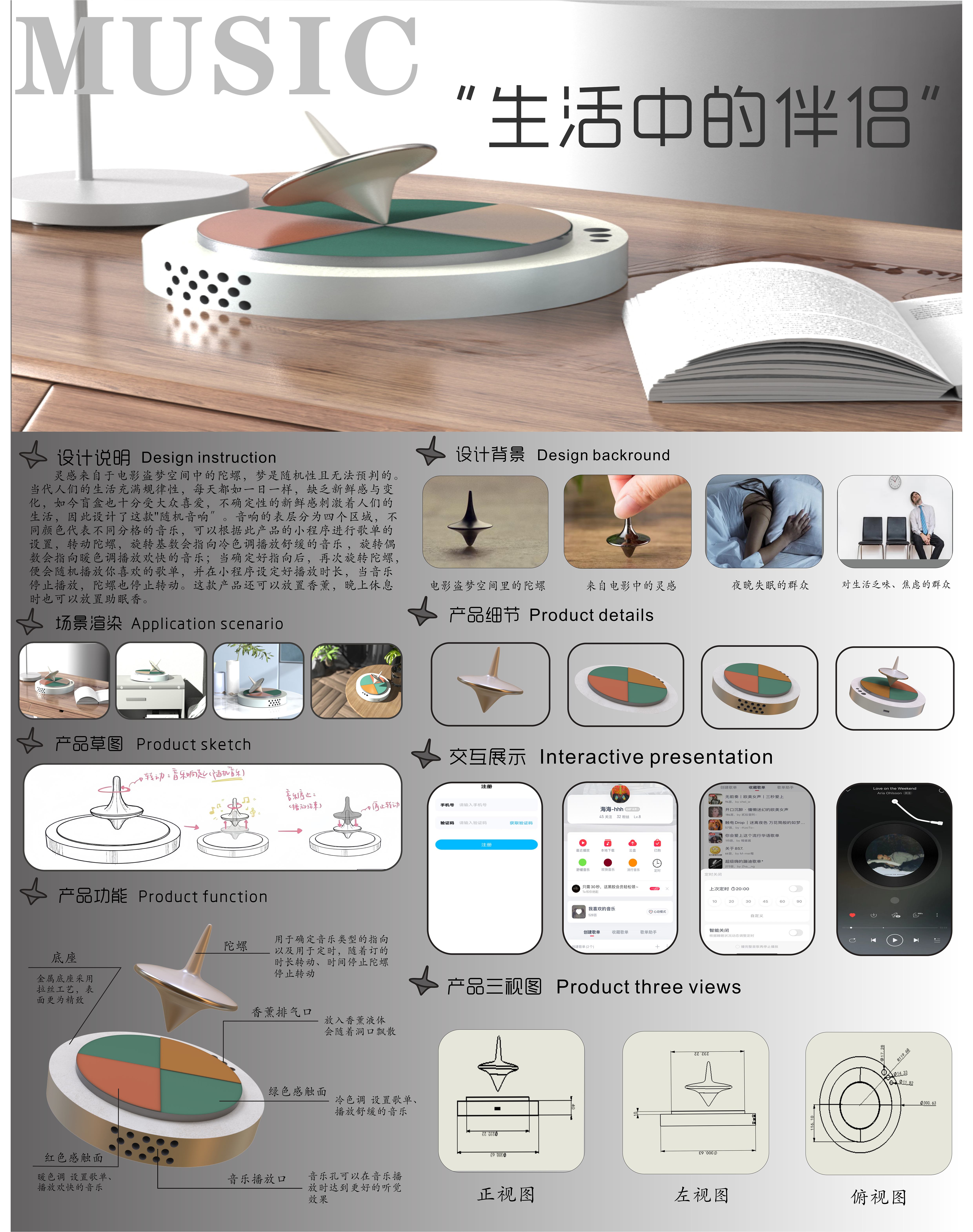 灵感来自于电影盗梦空间中的陀螺,梦是随机性且无法预判的。当代人们的生活充满规律性,每天都如一日一样,缺乏新鲜感与变化,如今盲盒也十分受大众喜爱,不确定性的新鲜感刺激着人们的生活•因此设计一款"随机音响〞。当转动陀螺时,陀螺悬浮并转动,音乐随之响起•歌曲都是系统随机播放的(产品使用之前会有用户 喜好设置,不会出现不喜欢的歌曲)当音乐播放结束后,陀螺停止 转动并下落。
