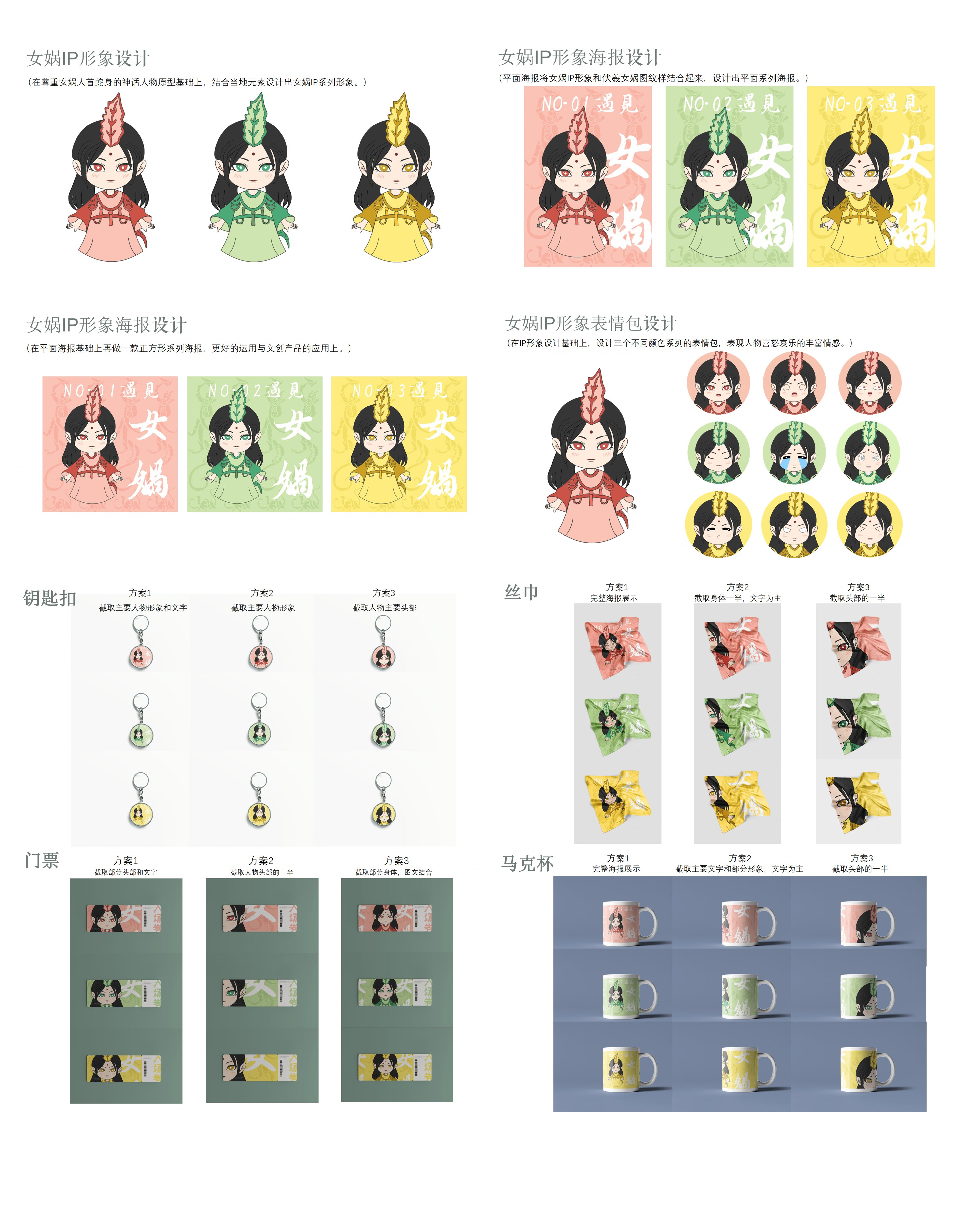 将古典人物女娲IP萌化为Q版潮流元素形象,尊重人首蛇身的神话原型,以女娲为本体,服饰及装饰方面结合潼关古城的当地元素,采用红、黄、绿的色彩运用,以潼关古城女娲山景区的女娲雕塑为原型,与现代的IP人物风格相结合,赋予女娲IP形象独特的涵义与故事。