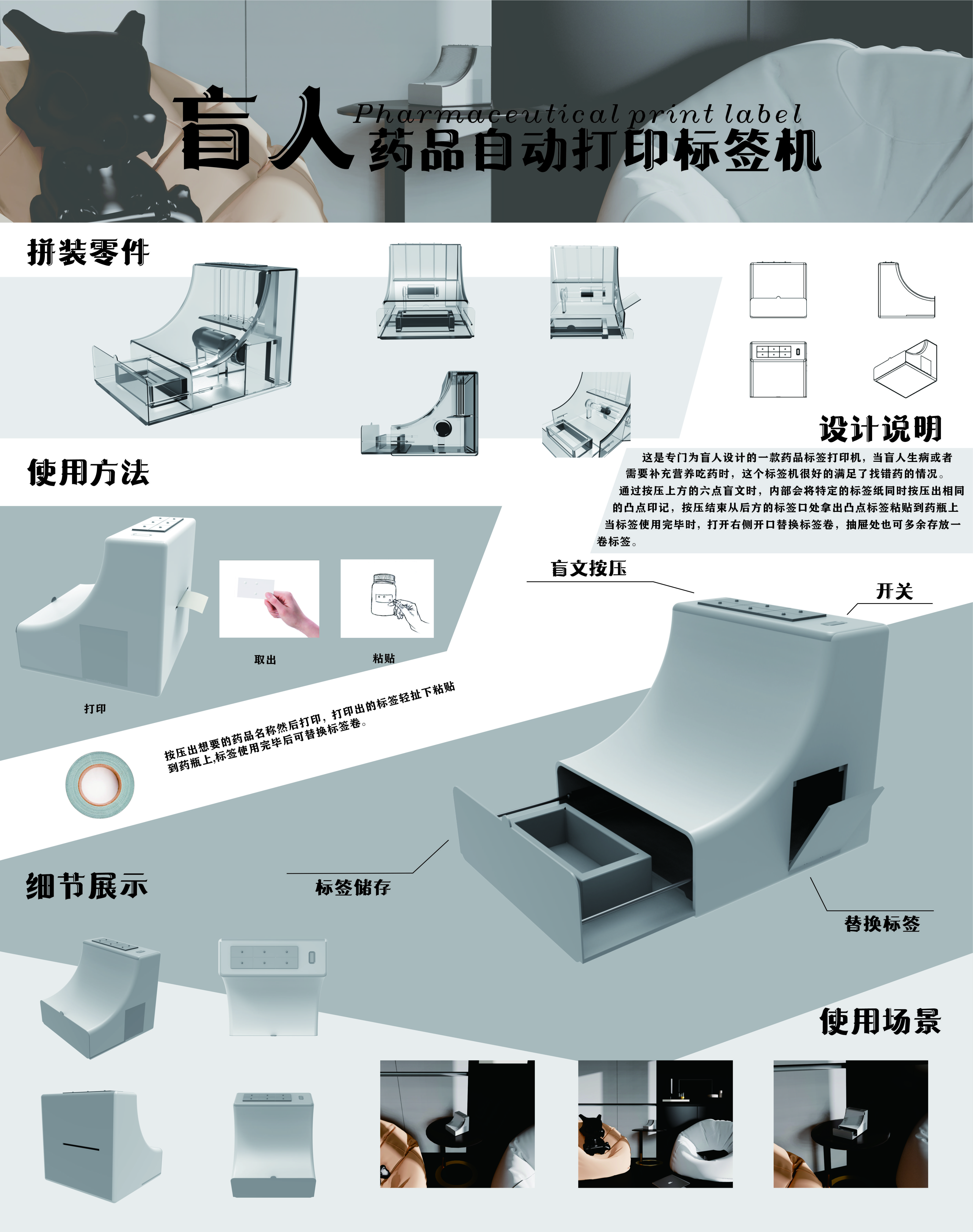 这是专门为盲人设计的一款药品标签打印机,当盲人生病或者需要补充营养吃药时,这个标签机很好的满足了找错药的情况。通过按压上方的六点盲文时,内部会将特定的标签纸按压出相同的凸点印记按压结束从后方的标签口处拿出凸点标签粘贴到药瓶上当标签使用完毕时可以打开右侧开口替换标签卷,抽屉处也可多余存放一卷标签。