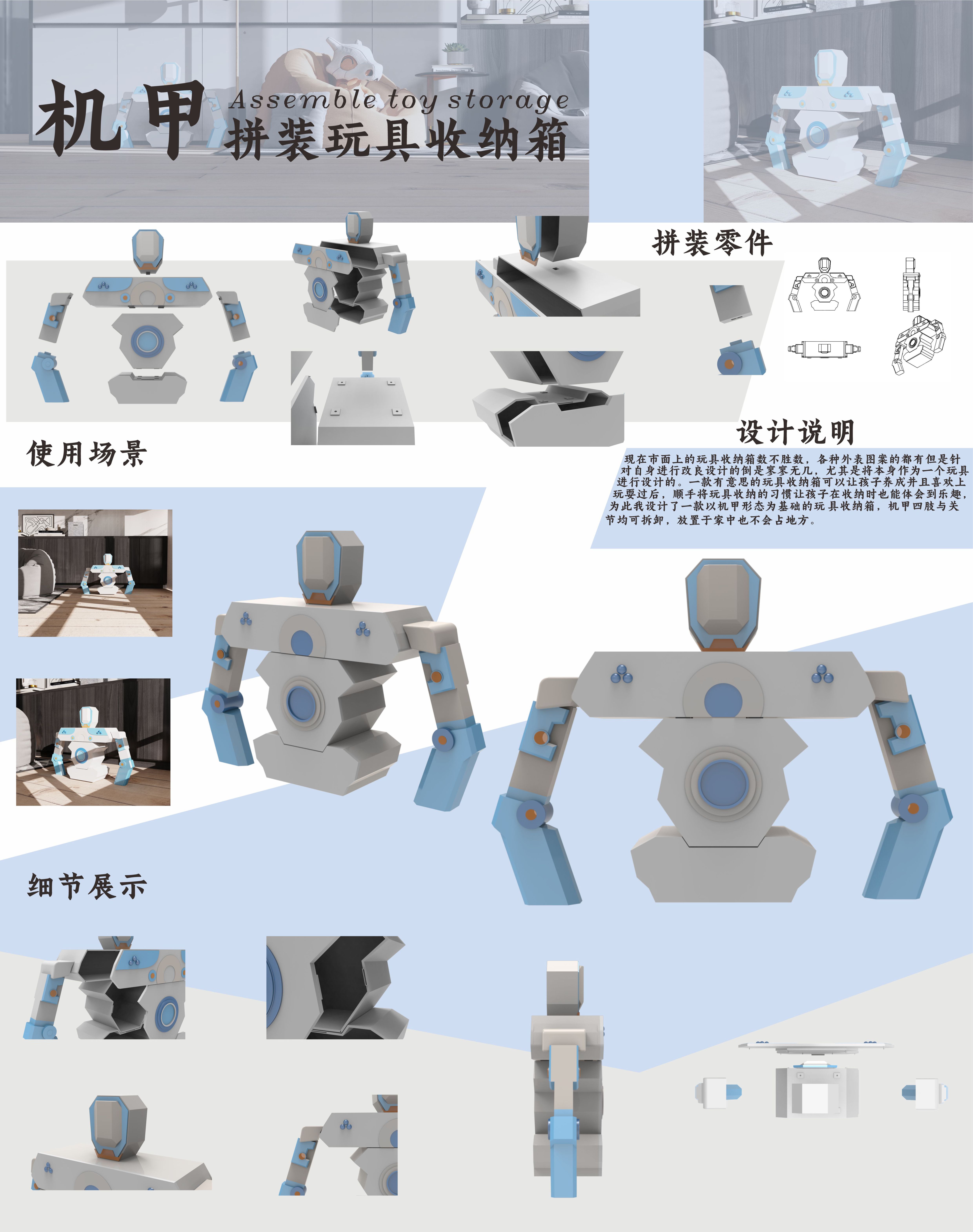 现在市面上的玩具收纳箱数不胜数,各种外表图案的都有但是针对自身进行改良设计的倒是寥寥无几,尤其是将本身作为一个玩具进行设计的。一款有意思的玩具收纳箱可以让孩子养成并且喜欢上玩耍过后,顺手将玩具收纳的习惯让孩子在收纳时也能体会到乐趣,为此我设计了一款以机甲形态为基础的玩具收纳箱,机甲四肢与关节均可拆卸,放置于家中也不会占地方。