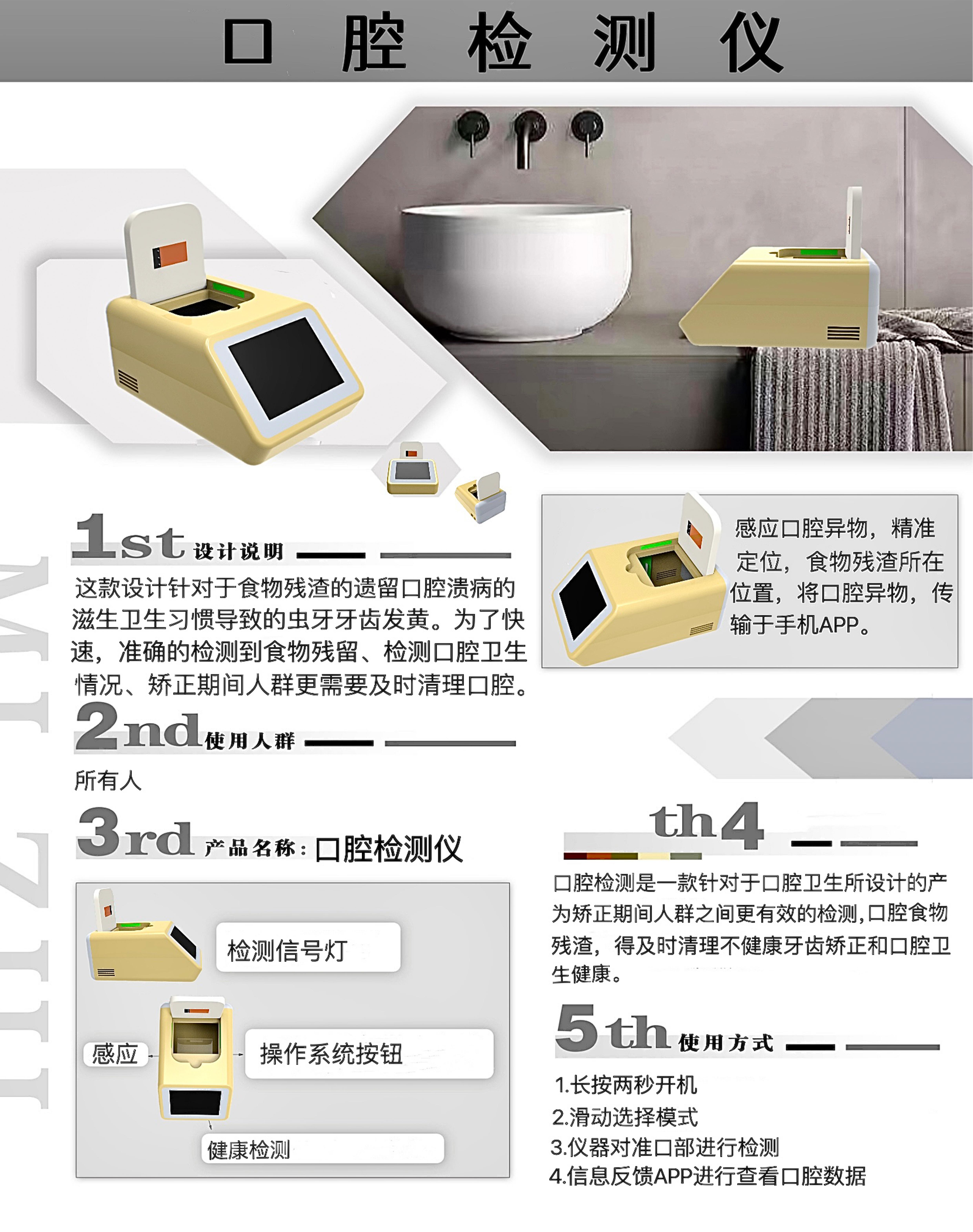 这款设计针对于食物残渣的遗留口腔溃病的滋生卫生习惯导致的虫牙牙齿发黄。为了快速,准确的检测到食物残留、检测口腔卫生情况、矫正期间人群更需要及时清理口腔。