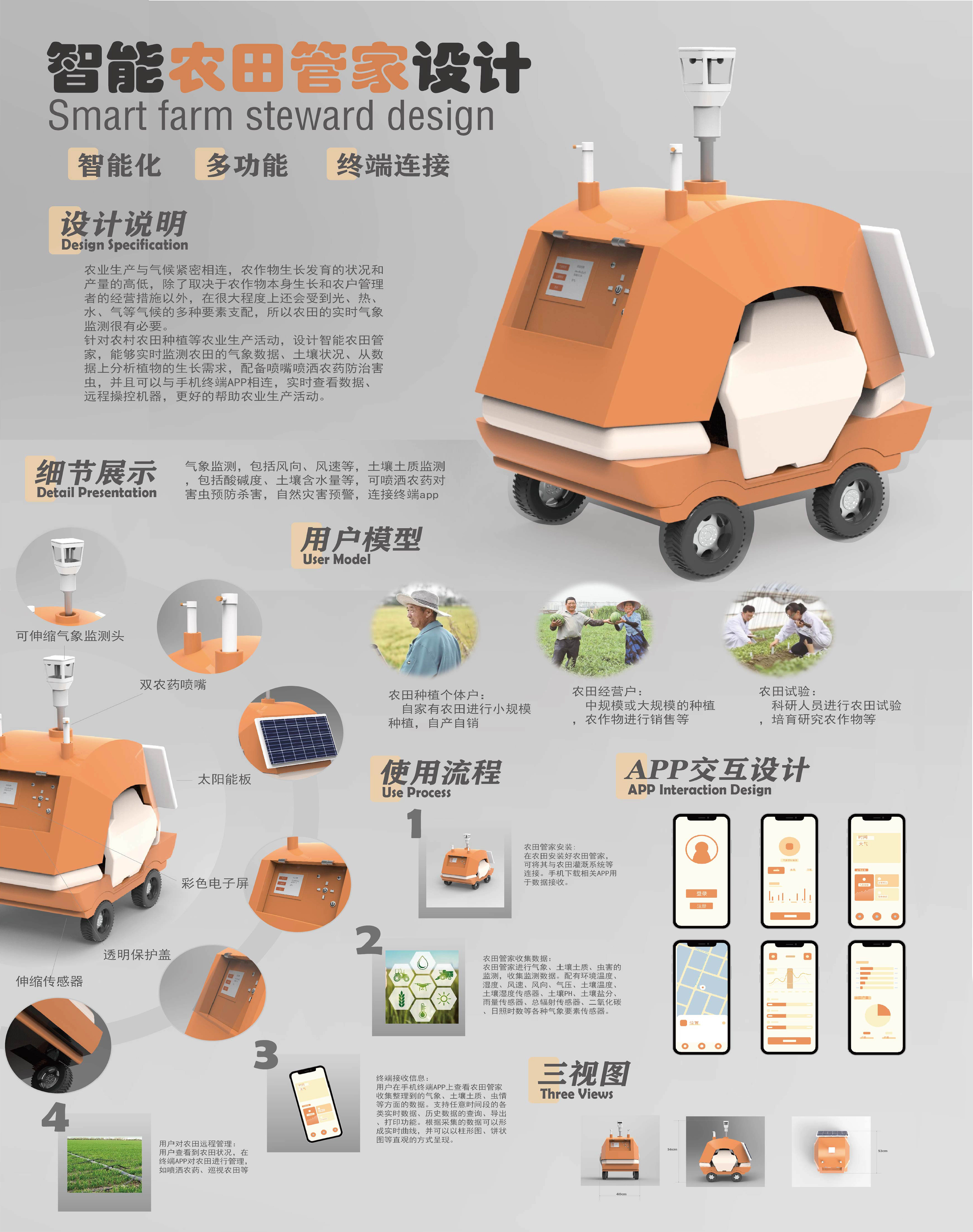 针对农村农田种植等农业生产活动,设计智能农田管家,能够实时监测农田的气象数据、土壤状况、从数据上分析植物的生长需求,配备喷嘴喷洒农药防治害虫,并且可以与手机终端APP相连,实时查看数据、远程操控机器,更好的帮助农业生产活动。