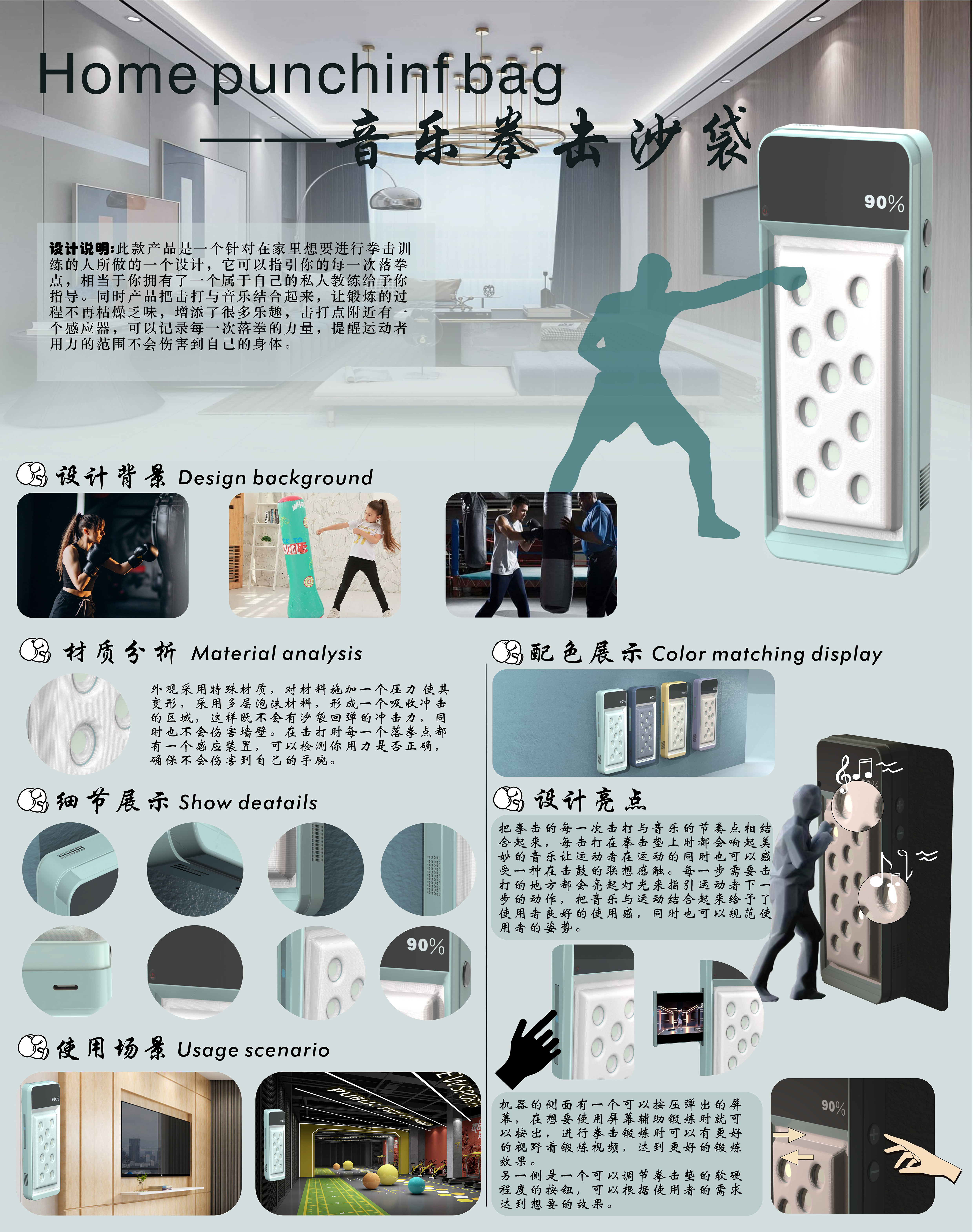 此款产品是一个针对在家里想要进行拳击训练的人所做的一个设计,它可以指引你的每一次落拳点,相当于你拥有了一个属于自己的私人教练给予你指导。同时产品把击打与音乐结合起来,让锻炼的过程不再枯燥乏味,增添了很多乐趣,击打点附近有一个感应器,可以记录每一次落拳的力量,提醒运动者用力的范围不会伤害到自己的身体。