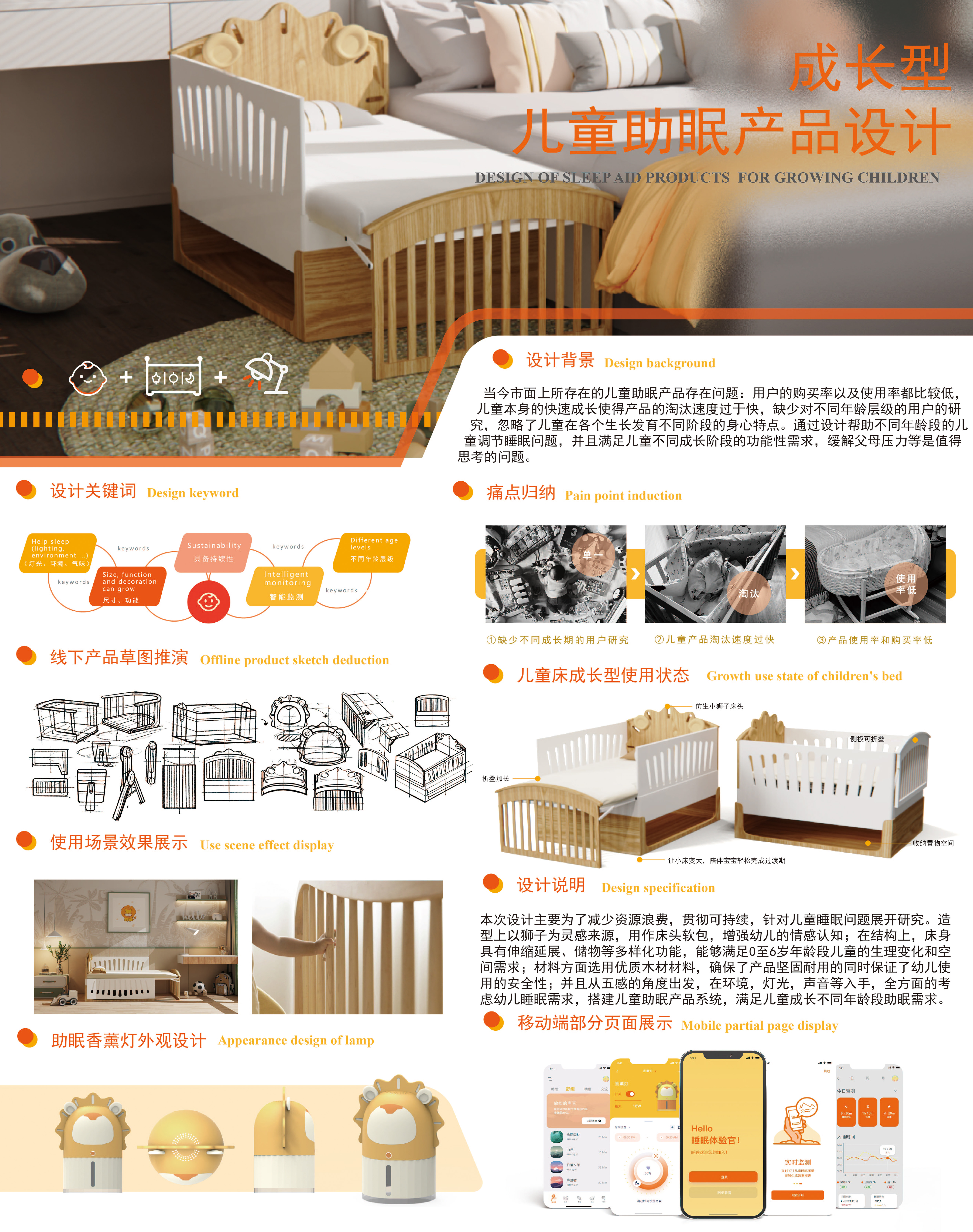 本次设计主要为了减少资源浪费,贯彻可持续,针对儿童睡眠问题展开研究。造型上以狮子为灵感来源,用作床头软包,增强幼儿的情感认知;在结构上,床身具有伸缩延展、储物等功能,能够满足0至6岁年龄段儿童的生理变化和空间需求;材料方面选用优质木材材料,确保了产品坚固耐用,保证了幼儿使用的安全性;并从五感角度出发,在环境,灯光,声音等入手,考虑幼儿睡眠需求,搭建儿童助眠产品系统,满足儿童成长不同年龄段助眠需求。