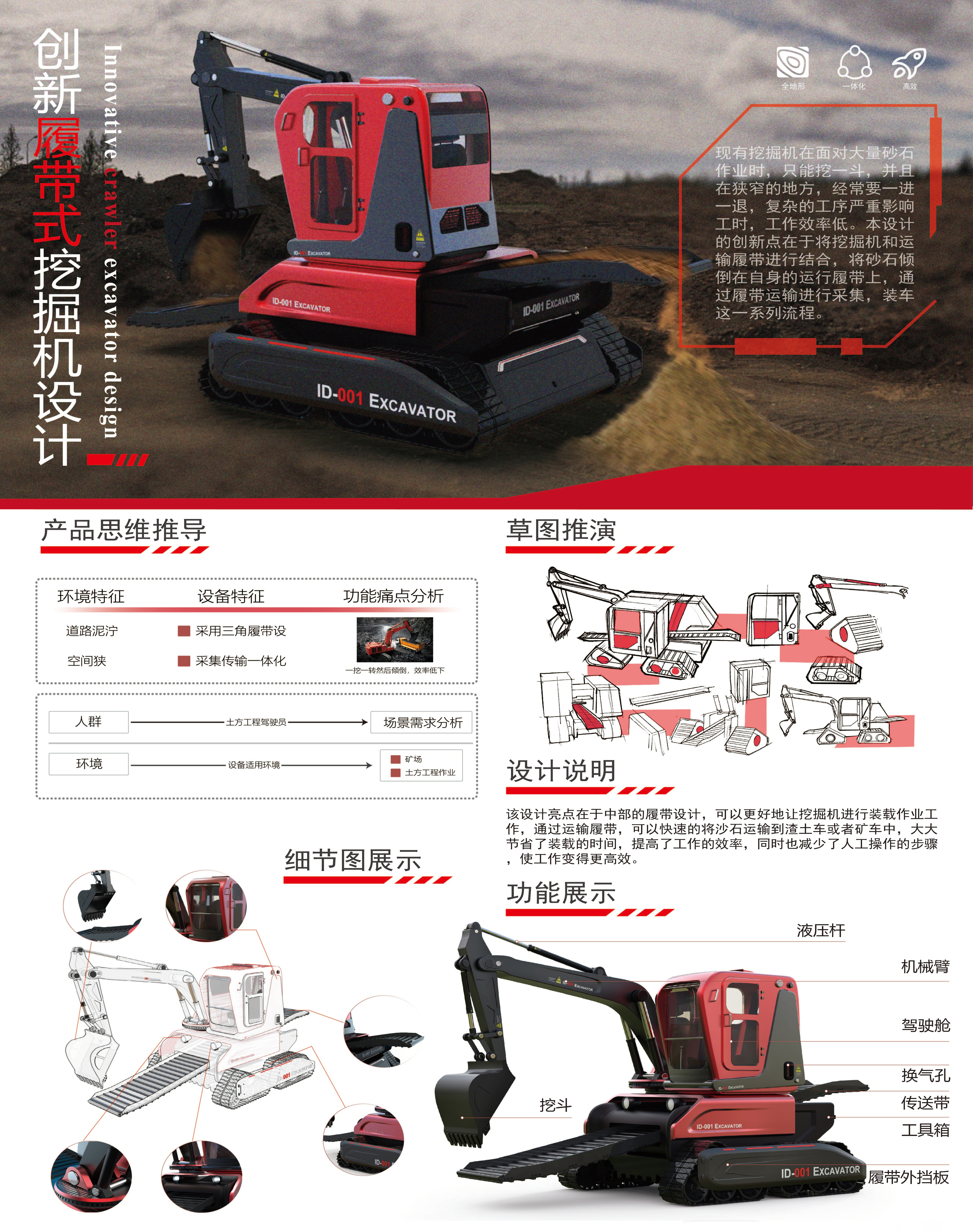 该设计亮点在于中部的履带设计,可以更好地让挖掘机进行装载作业工作,通过运输履带,可以快速的将沙石运输到渣土车或者矿车中,使工作变得更高效,节省了装载的时间,提高了工作的效率,同时也减少了人工操作的步骤。