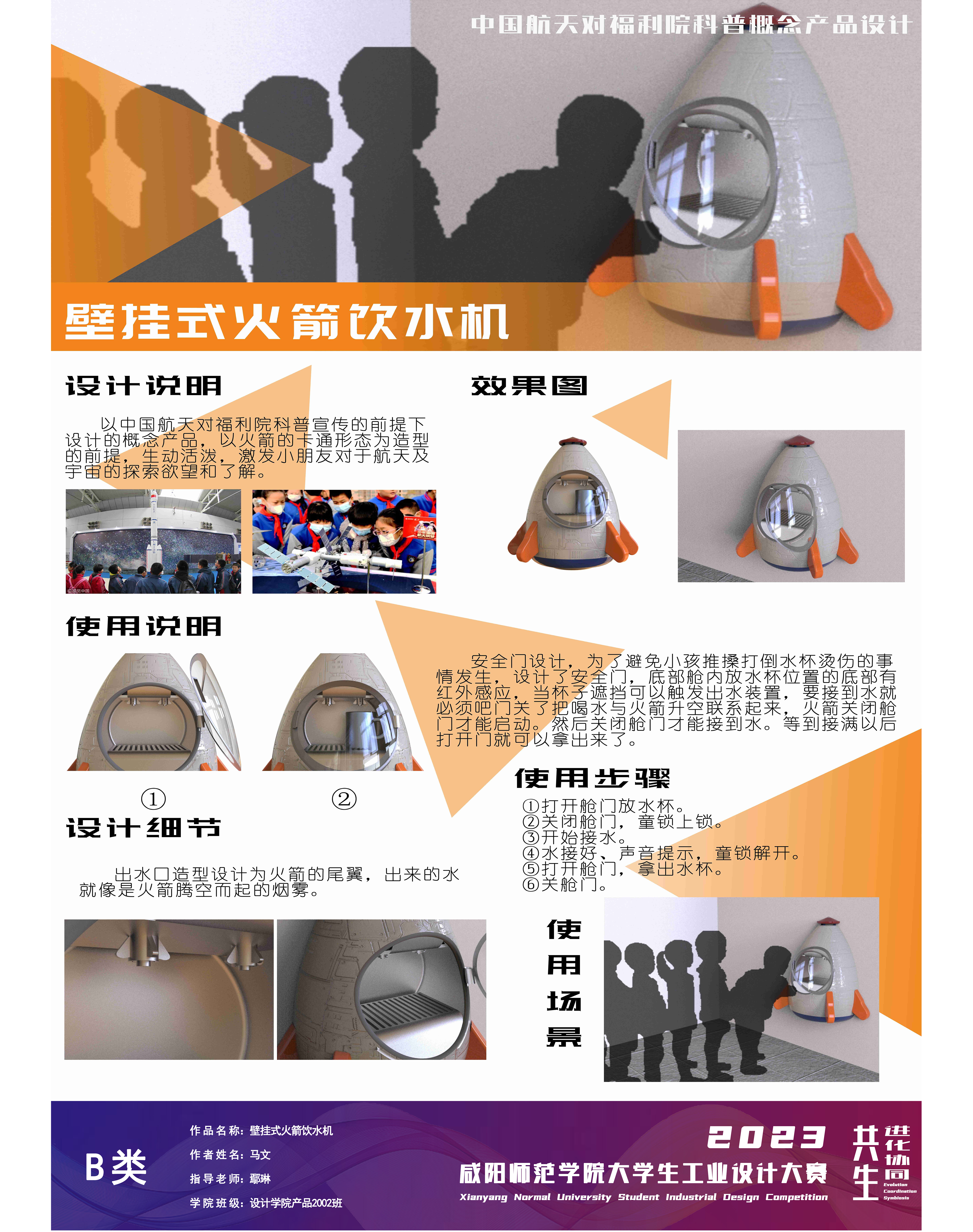 以中国航天对福利院科普宣传的前提下设计的概念产品,以火箭的卡通形态为造型的前提,生动活泼,激发小朋友对于航天及宇宙的探索欲望和了解。安全门设计,为了避免小孩推搡打倒水杯烫伤的事情发生,设计了安全门,底部舱内放水杯位置的底部有红外感应,当杯子遮挡可以触发出水装置,要接到水就必须吧门关了把喝水与火箭升空联系起来,火箭关闭舱门才能启动。然后关闭舱门才能接到水。等到接满以后打开门就可以拿出来了。