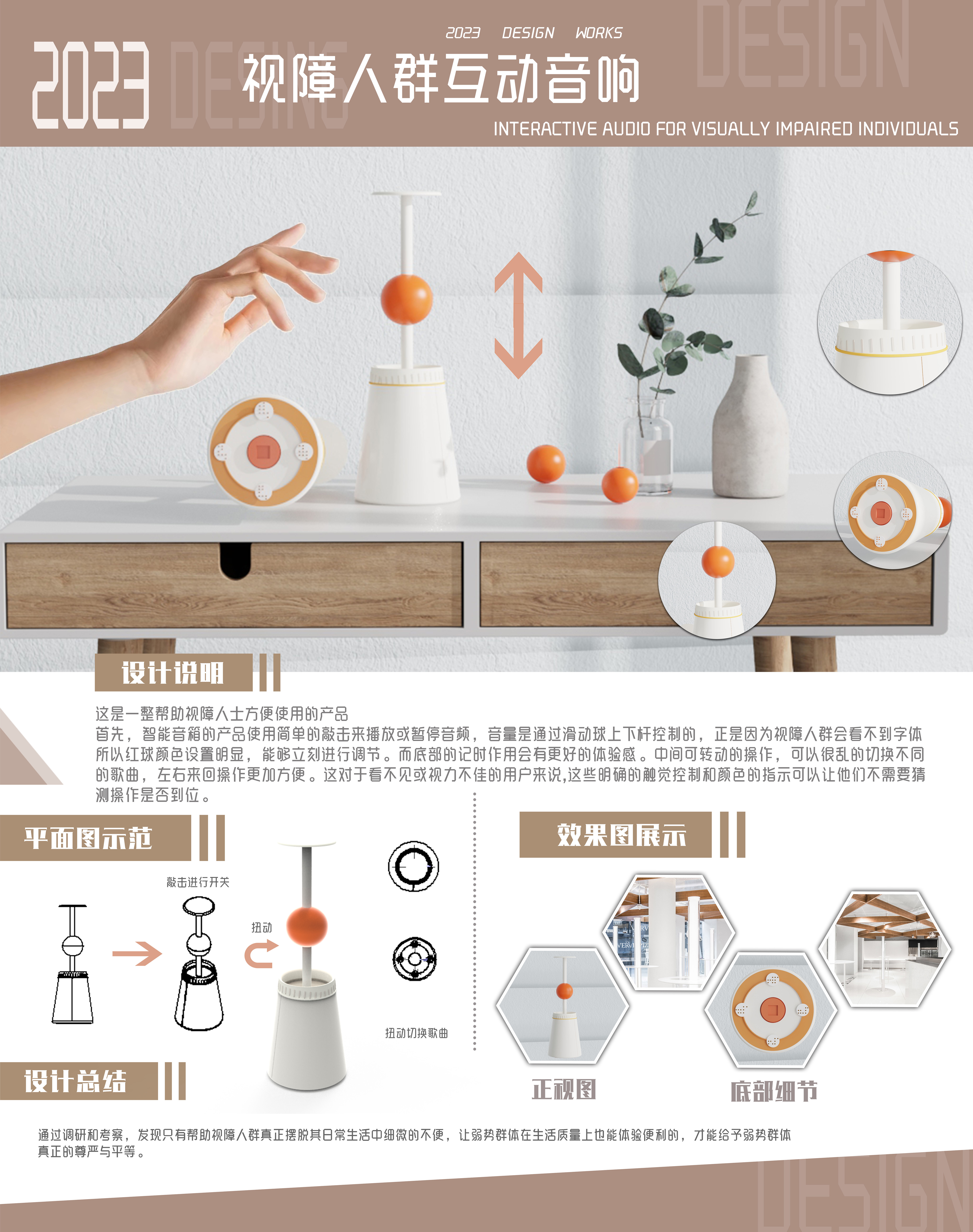 这是一整帮助视障人士方便使用的产品 首先,智能音箱的产品使用简单的敲击来播放或暂停音频,音量是通过滑动球上下杆控制的,正是因为视障人群会看不到字体所以红球颜色设置明显,能够立刻进行调节。而底部的记时作用会有更好的体验感。中间可转动的操作,可以很乱的切换不同的歌曲,左右来回操作更加方便。这对于看不见或视力不佳的用户来说,这些明确的触觉控制和颜色的指示可以让他们不需要猜测操作是否到位。
