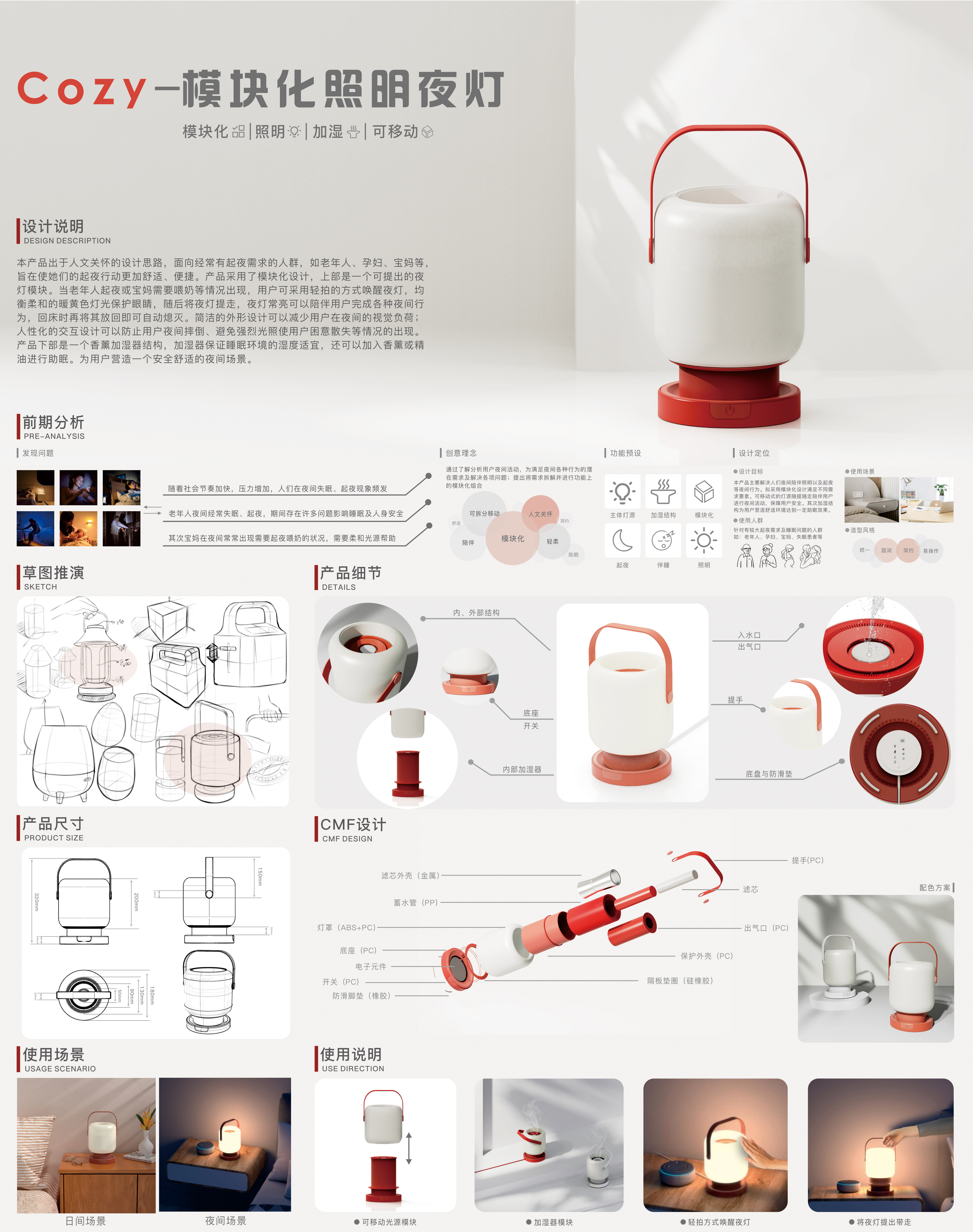 本产品出于人文关怀设计思路,面向常有起夜需求的人群,如老年人、孕妇、宝妈等。采用模块化设计,上部为可提出夜灯。老年人起夜或宝妈需要喂奶时,可采用轻拍方式唤醒夜灯,柔和的灯光保护眼睛,将夜灯提走,夜灯常亮可以陪伴用户活动,放回自动熄灭。简洁外形减少用户视觉负荷;人性化交互防止用户夜间摔倒、避免强光使用户困意散失。下部加湿结构,保证睡眠环境湿度适宜,可加入香薰或精油助眠,为用户营造安全舒适的夜间场景。
