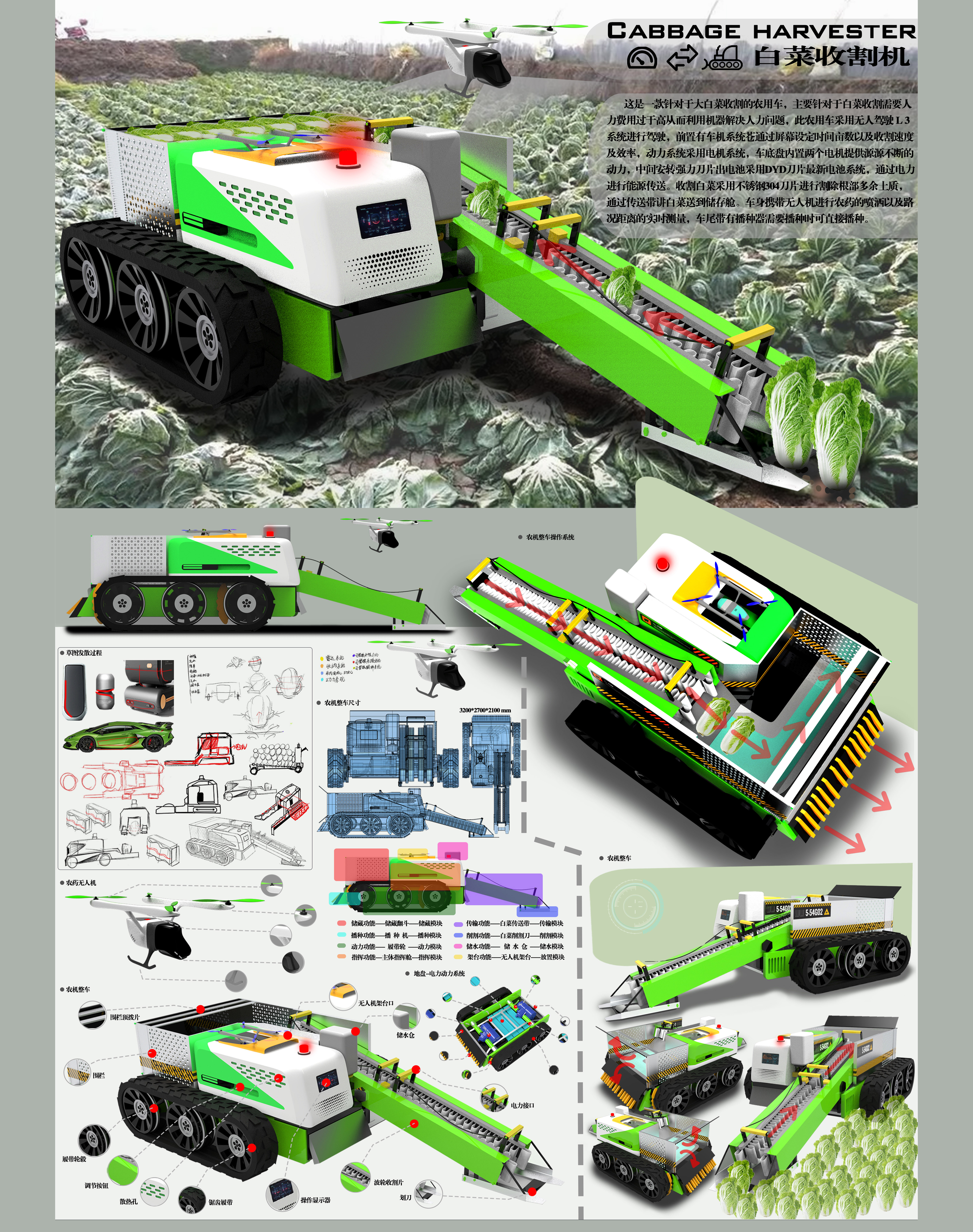 这是一款针对于大白菜收割的农用车,主要针对于白菜收割需要的人力费用过高从而利用机器解决人力问题。此农用车采用无人驾驶L3系统进行驾驶,前置车机系统,通过屏幕设定时间调整收割速度。动力系统采用电力驱动,底盘内置两个电机提供动力,白菜收割采用不锈钢304刀片,割除根部多余土质,通过传送带将白菜送到储存仓。车身携带无人机进行农药喷洒及路况距离的实时测量。车尾带有播种器,需要播种时可直接播种。