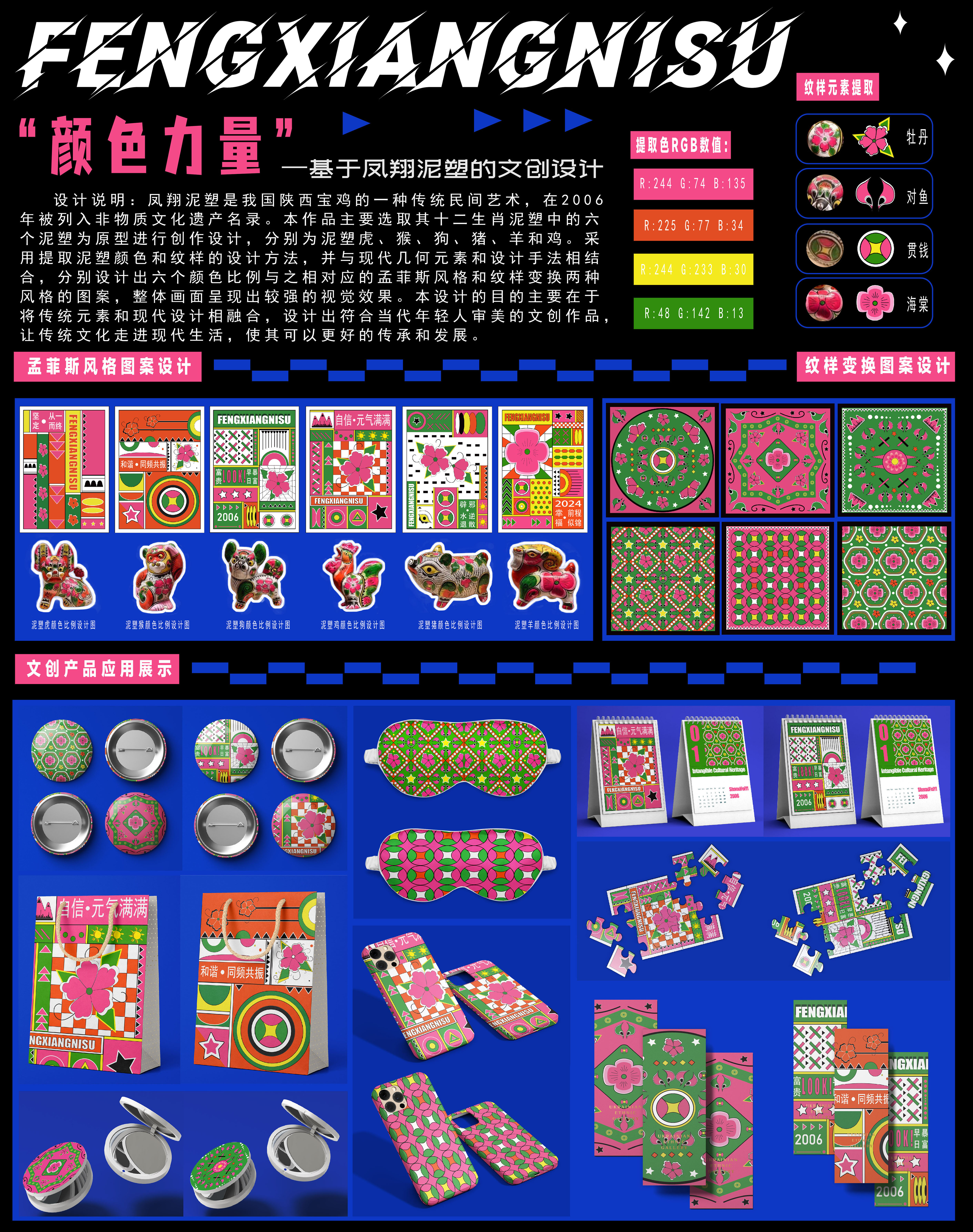 凤翔泥塑是我国陕西宝鸡的一种传统民间艺术,本设计选取其十二生肖泥塑中的六个泥塑为原型进行创作设计,分别为泥塑虎、猴、狗、猪、羊和鸡。提取泥塑颜色和纹样,并与现代几何元素相结合,分别设计出六个颜色比例与之相对应的孟菲斯风格图案和纹样变换风格的图案,整体画面呈现出较强的视觉效果,并应用于现代生活品中,符合当代年轻人审美风格。让传统文化走进现代生活,使其可以更好的传承和发展。