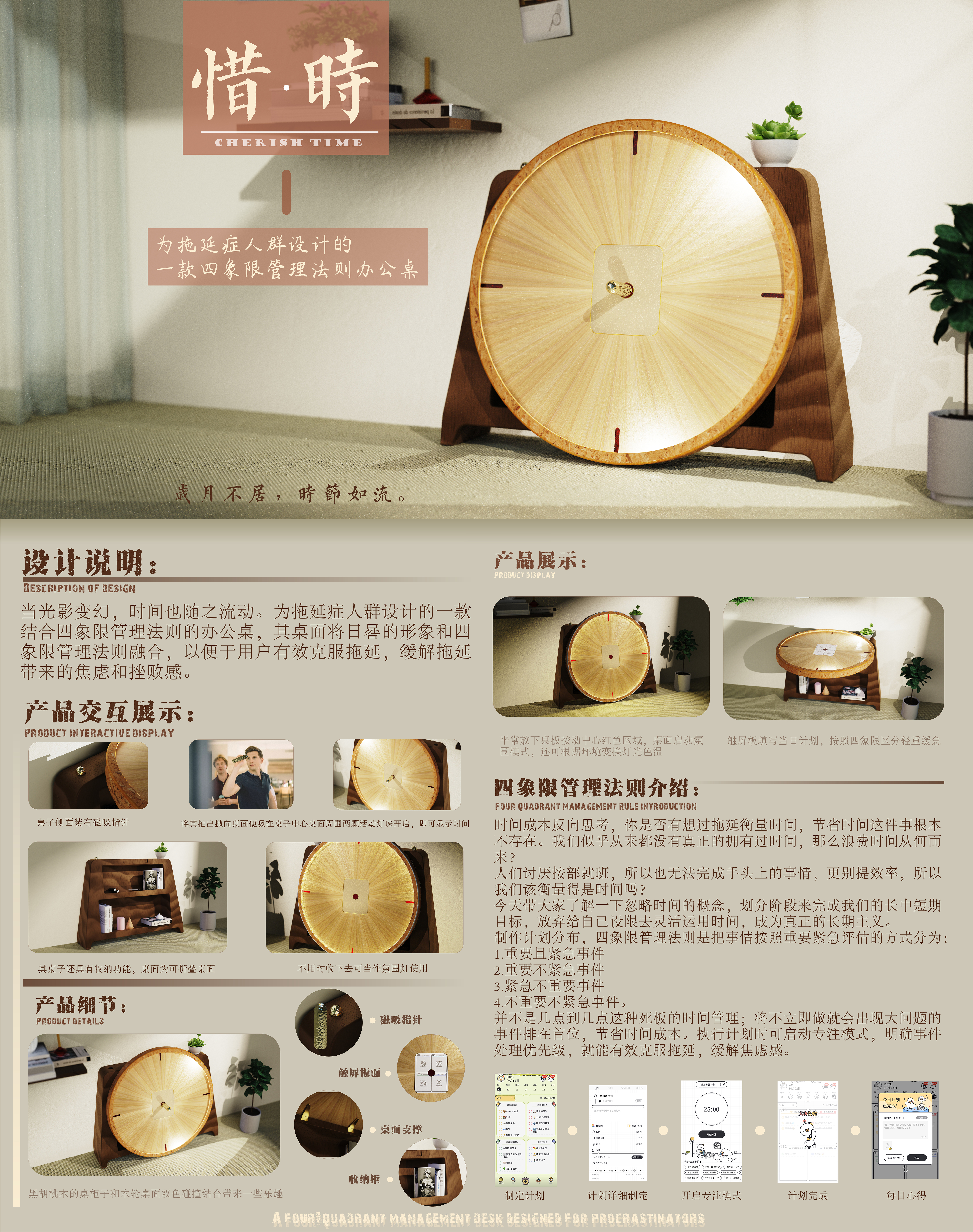 当光影变幻,时间也随之流动。为拖延症人群设计的一款结合四象限管理法则的办公桌,其桌面将日晷的形象和四象限管理法则融合,以便于用户有效克服拖延,缓解拖延带来的焦虑和挫败感。