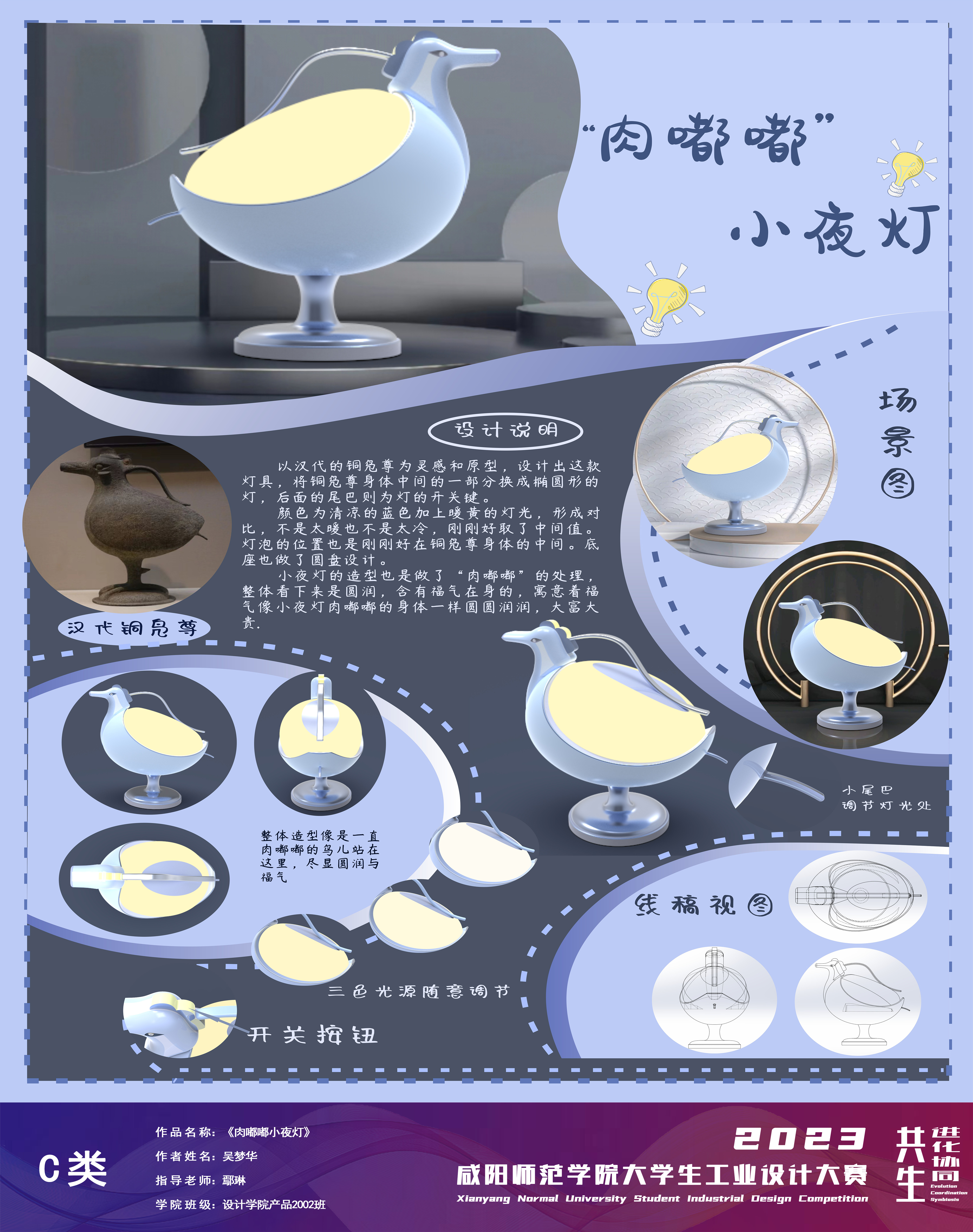 以汉代的铜凫尊为灵感和原型,设计出这款灯具,将铜凫尊身体中间的一部分换成椭圆形的灯,后面的尾巴则为灯的开关键。 颜色为清凉的蓝色加上暖黄的灯光,形成对比,不是太暖也不是太冷,刚刚好取了中间值。灯泡的位置也是刚刚好在铜凫尊身体的中间。底座也做了圆盘设计。 小夜灯的造型也是做了“肉嘟嘟”的处理,整体看下来是圆润,含有福气在身的,寓意着福气像小夜灯肉嘟嘟的身体一样圆圆润润,大富大贵.