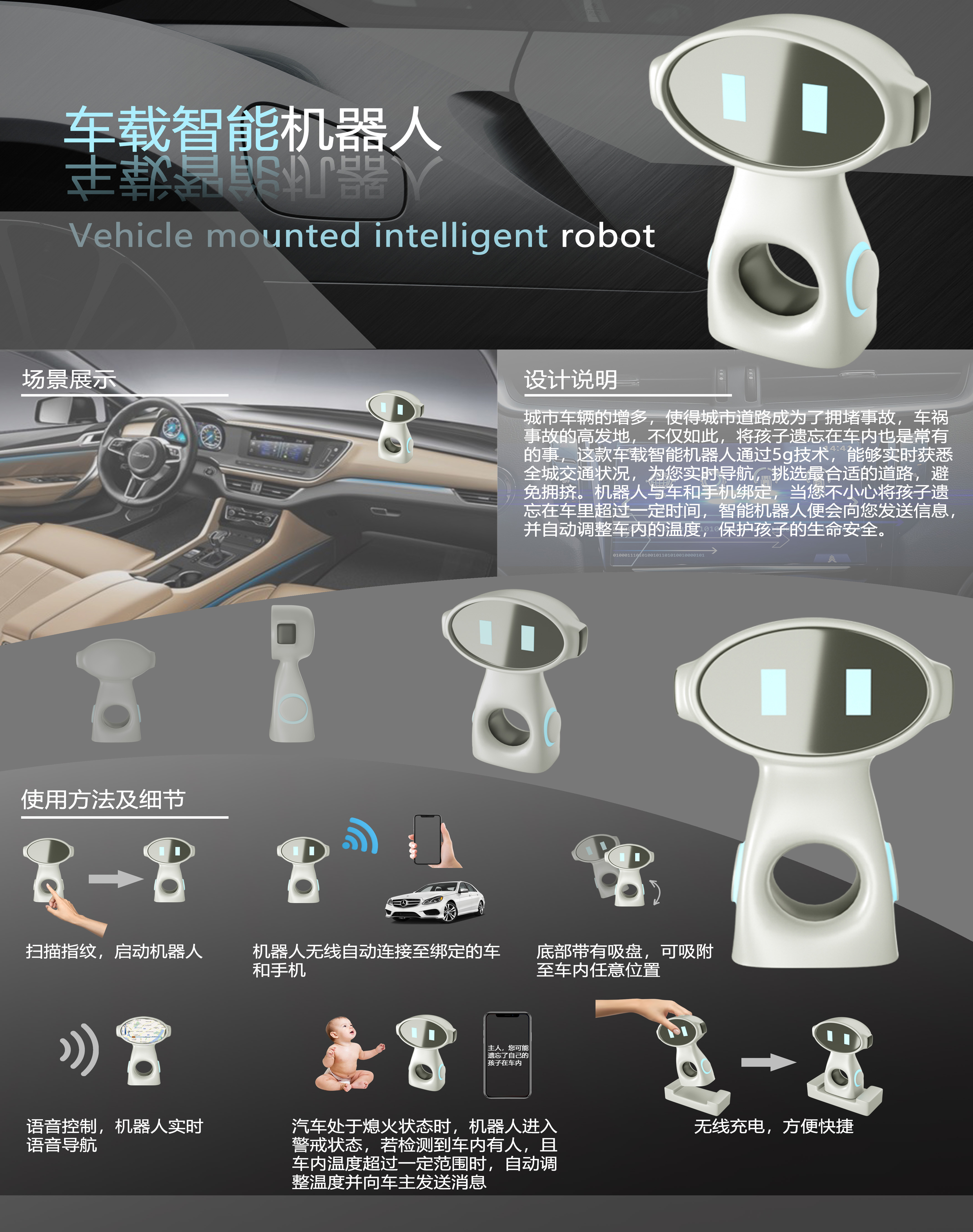 城市车辆的增多,使得城市道路成为了拥堵事故,车祸事故的高发地。不仅如此,将孩子遗忘在车内也是常有的事。这款车载智能机器人通过5g技术,能够实时获悉全城交通状况,为您实时导航,挑选最合适的道路,避免拥挤。机器人与车和手机绑定,当您不小心将孩子遗忘在车里超过一定时间,智能机器人便会向您发送信息并自动调整车内的温度,保护孩子的生命安全。