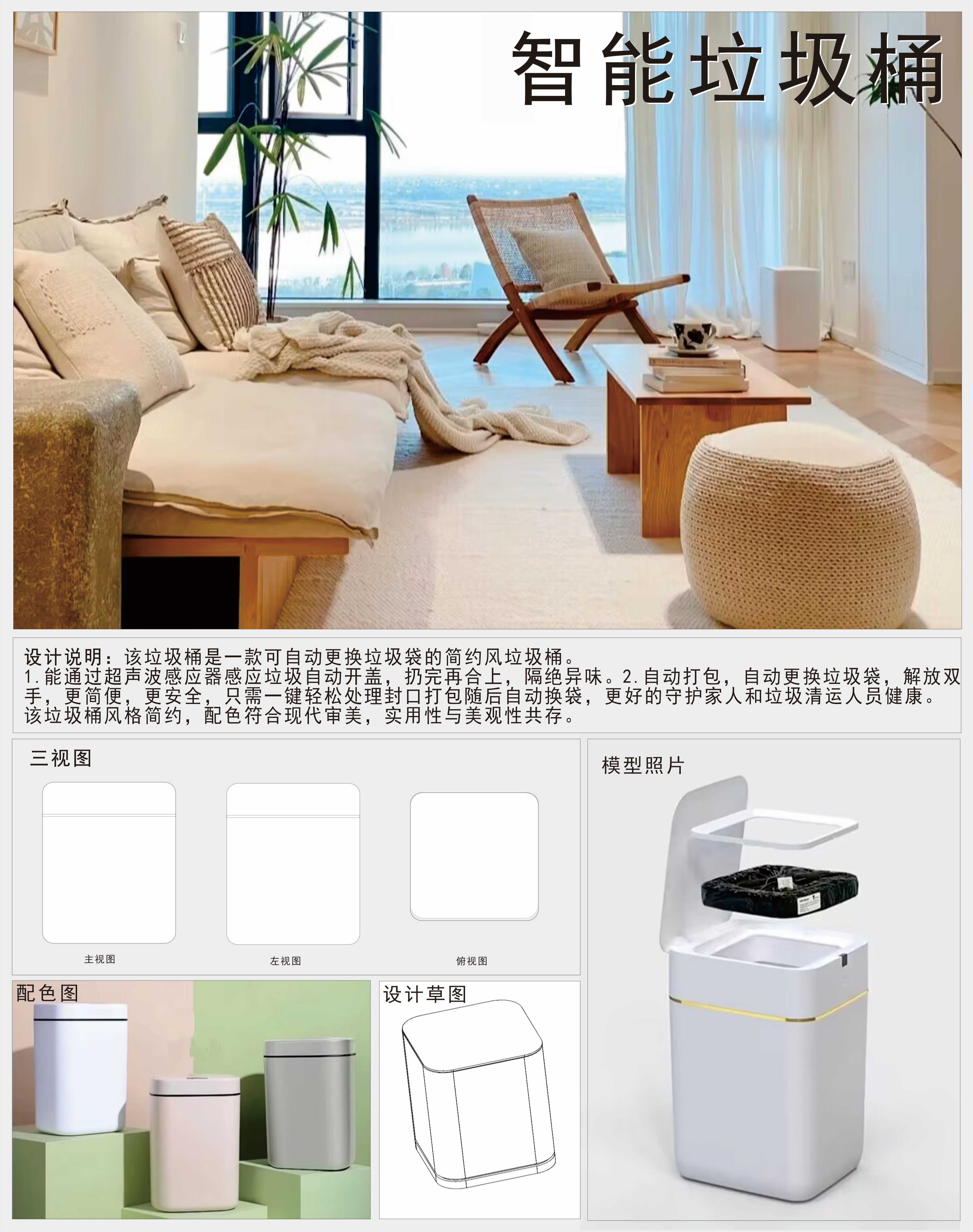 设计说明:该垃圾桶是一款可自动更换垃圾袋的简约风垃圾桶。 1.能通过超声波感应器感应垃圾自动开盖,扔完再合上,隔绝异味。2.自动打包,自动更换垃圾袋,解放双 手,更简便,更安全,只需一键轻松处理封口打包随后自动换袋,更好的守护家人和垃圾清运人员健康。 该垃圾桶风格简约,配色符合现代审美,实用性与美观性共存。