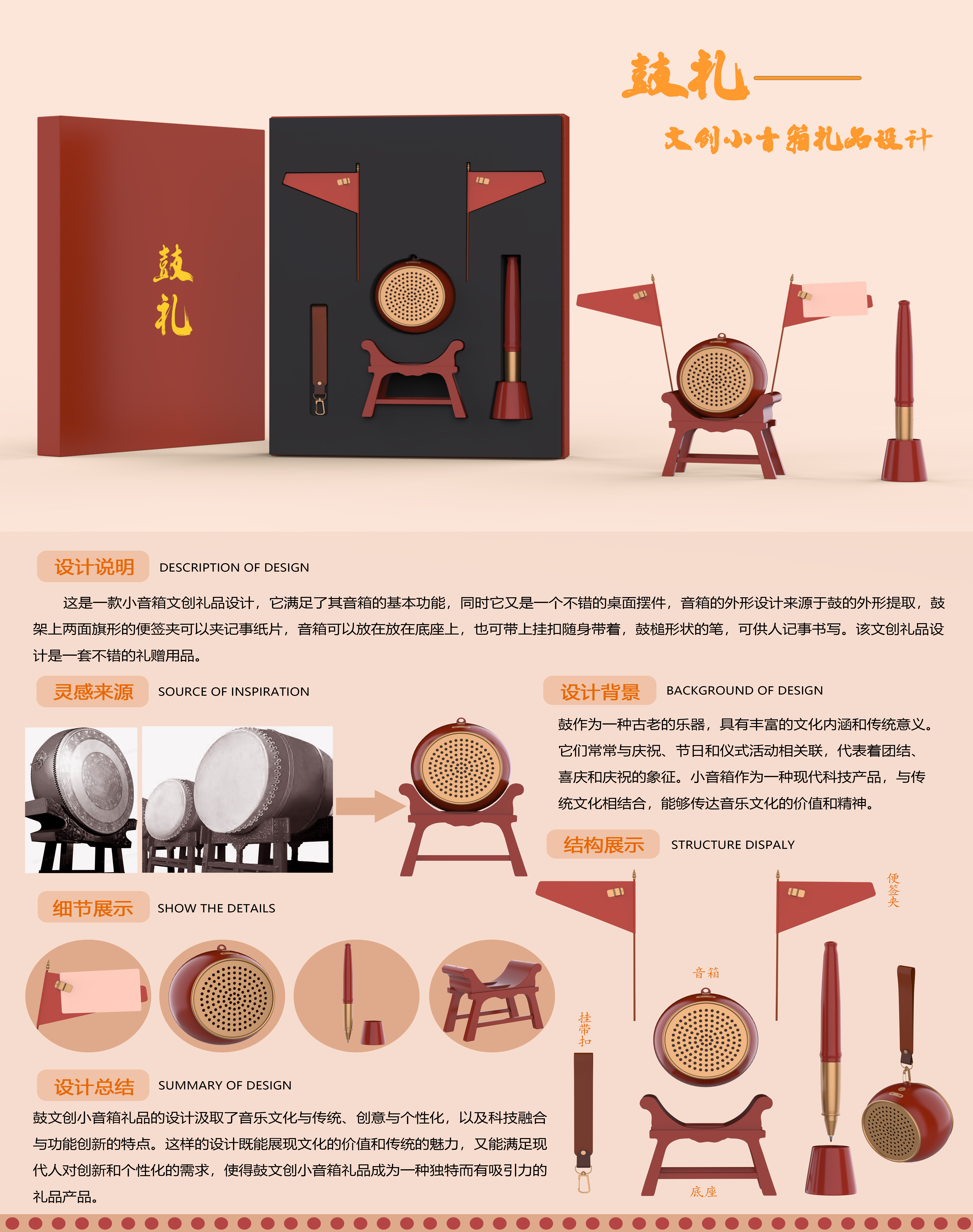 鼓作为一种古老的乐器,具有丰富的文化内涵和传统意义。小音箱作为一种现代科技产品,与传统文化相结合,能够传达音乐文化的价值和精神。该产品一款小音箱文创礼品设计,它满足了其音箱的基本功能,同时它又是一个不错的桌面摆件,音箱的外形设计来源于鼓的外形提取,鼓架上两面旗形的便签夹可以夹记事纸片,音箱可以放在放在底座上,也可带上挂扣随身带着,鼓槌形状的笔,可供人记事书写。该文创礼品设计是一套不错的礼赠用品。