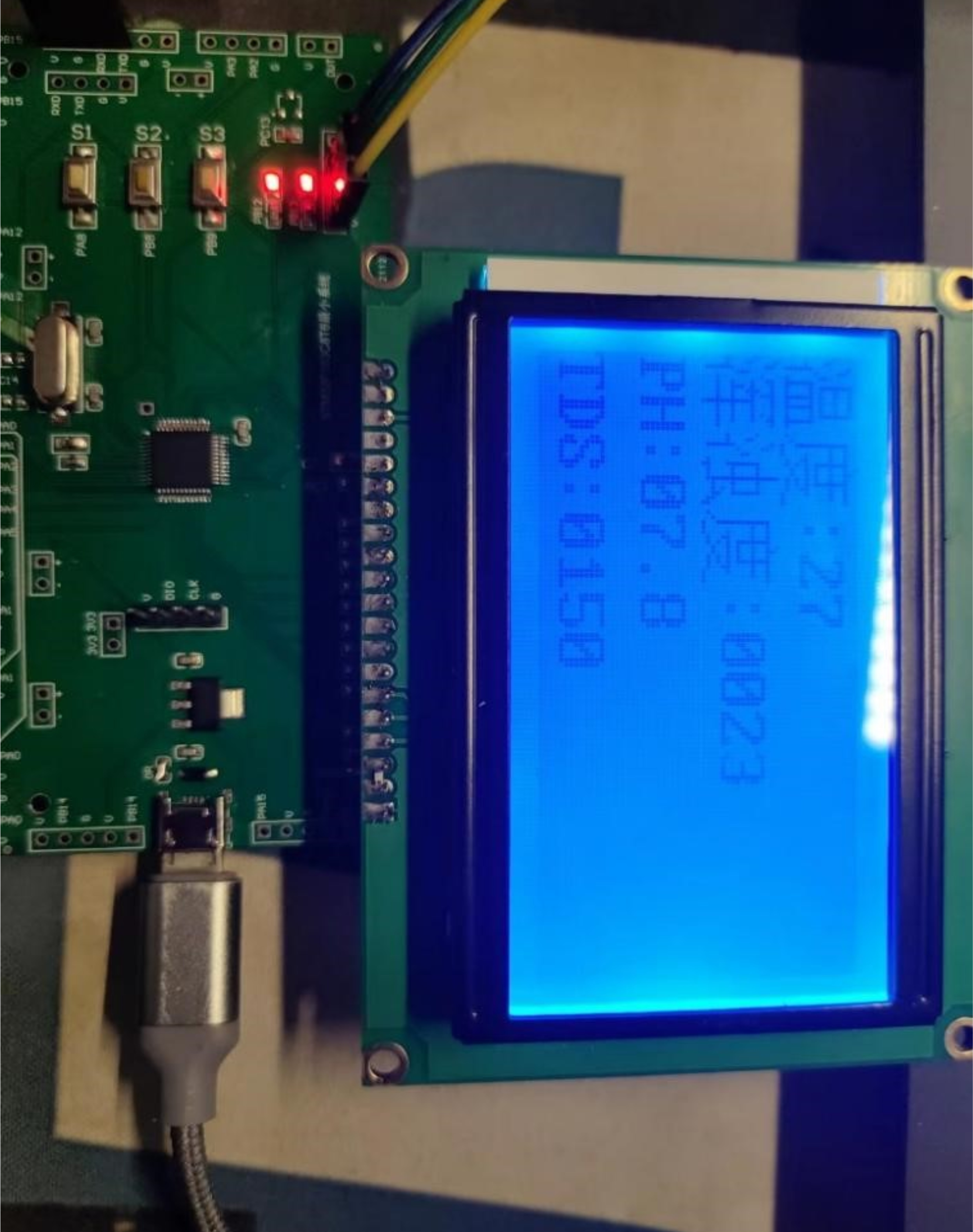 本设计基于STM32设计了水质检测系统,主要包括单片机模块、信号采集模块、信号转换模块和显示模块。通过浊度传感器、PH值传感器等获取水体的浊度、酸碱度等信息,然后利用AD转换器将采集到的模拟信号转换成数字信号并输入单片机对数据进行处理,最后将浊度、PH值和溶解性固体总量在LCD12864液晶上显示。该水质检测系统体积小,价格低,操作简单,可以广泛应用于家庭日常水质检测和户外水质检测等场合。