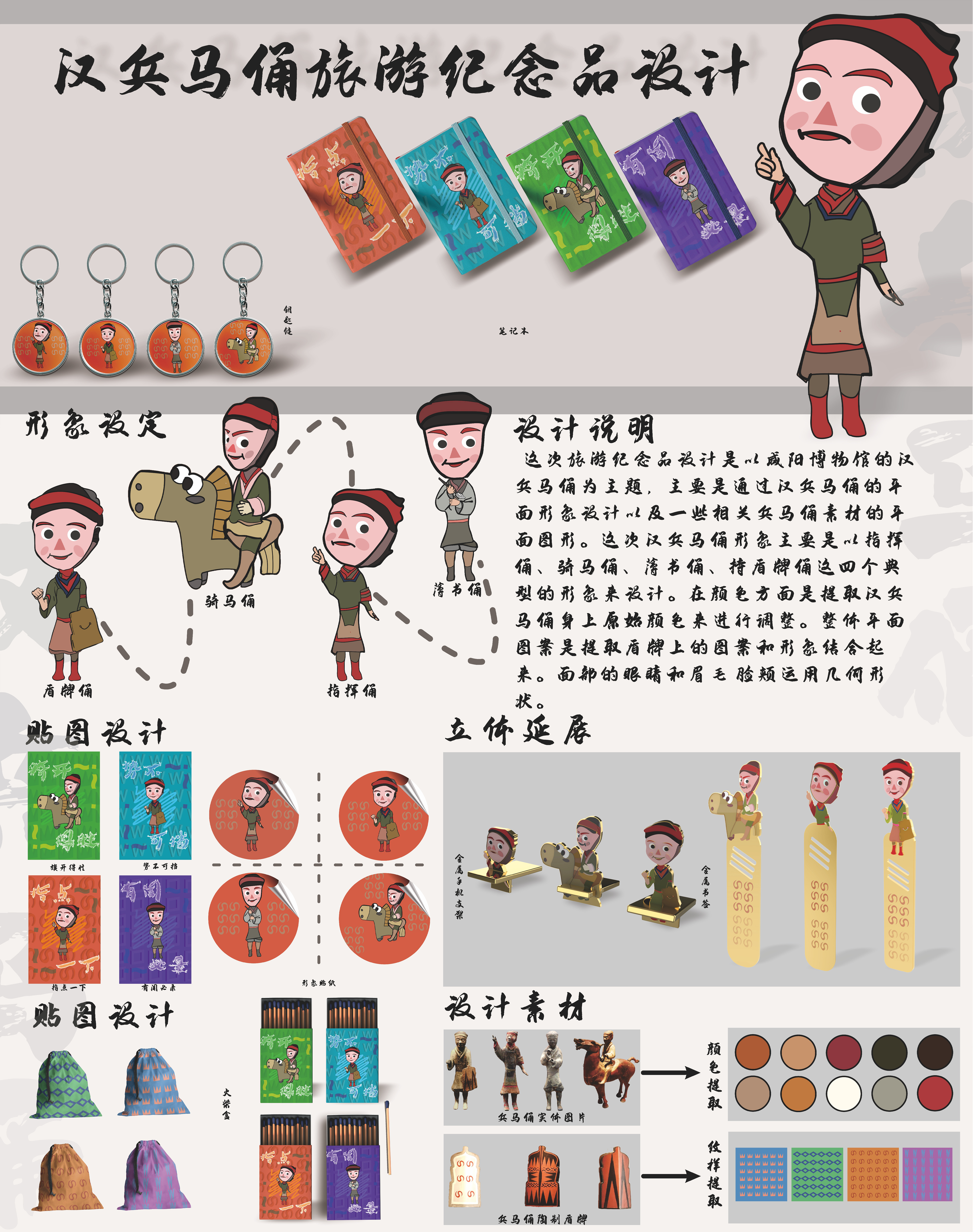 这次旅游纪念品设计是以咸阳博物馆的汉兵马俑为主题,主要是通过汉兵马俑的平面形象设计以及一些相关兵马俑素材的平面图形。这次汉兵马俑形象主要是以指挥俑、骑马俑、薄书俑、持盾牌俑这四个典型的形象来设计。在颜色方面是提取汉兵马俑身上原始颜色来进行调整。整体平面图案是提取盾牌上的图案和形象结合起来。面部的眼睛和眉毛脸颊运用几何形状表现。