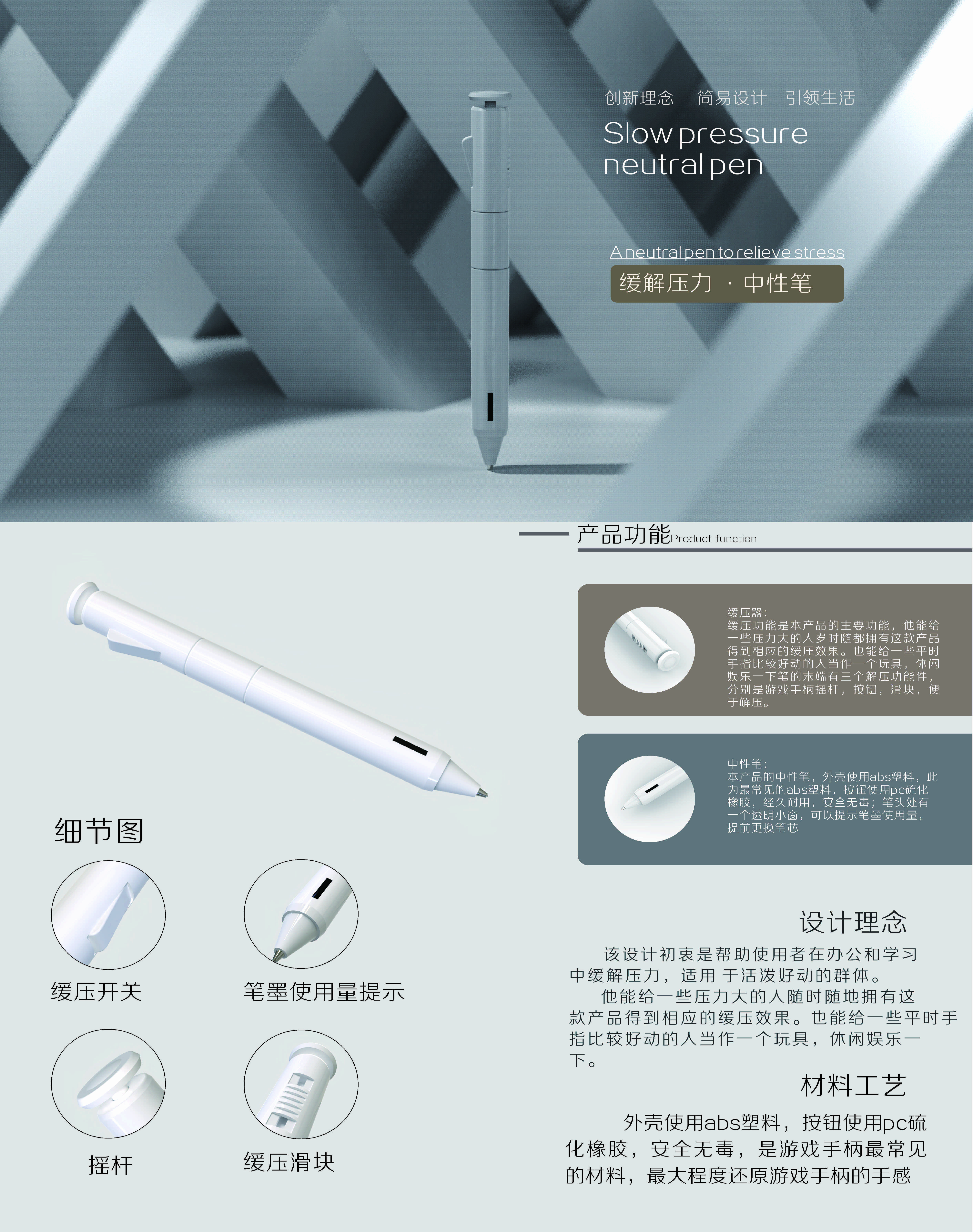 该设计初衷是帮助使用者在办公和学习 中缓解压力,适用 于活泼好动的群体。 他能给一些压力大的人随时随地拥有这 款产品得到相应的缓压效果。也能给一些平时手 指比较好动的人当作一个玩具,休闲娱乐一 下。 外壳使用abs塑料,按钮使用pc硫化橡胶, 安全无毒,是游戏手柄最常见的材料,安全无 毒,最大程度还原游戏手柄的手感。