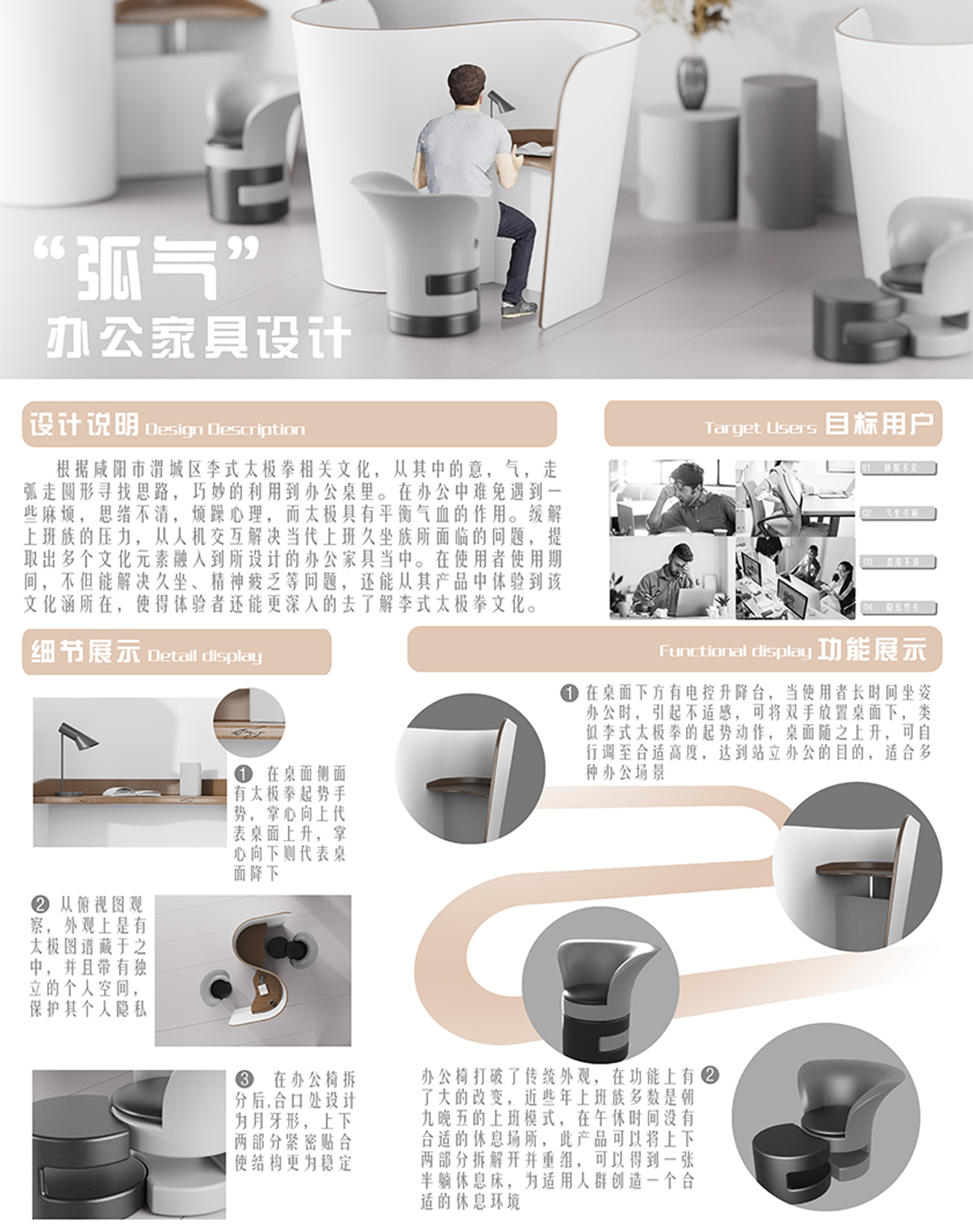 根据咸阳市渭城区李式太极拳相关文化,从其中的意,气,走弧走圆形寻找思路,巧妙的利用到办公桌里。在办公中难免遇到一些麻烦,思绪不清,烦躁心理,而太极具有平衡气血的作用。缓解上班族的压力,提取出多个文化元素融入到所设计的办公家具当中。在使用者使用期间,不但能解决久坐、精神疲乏等问题,还能从其产品中体验到该文化涵所在,使得体验者还能更深入的去了解李式太极拳文化。