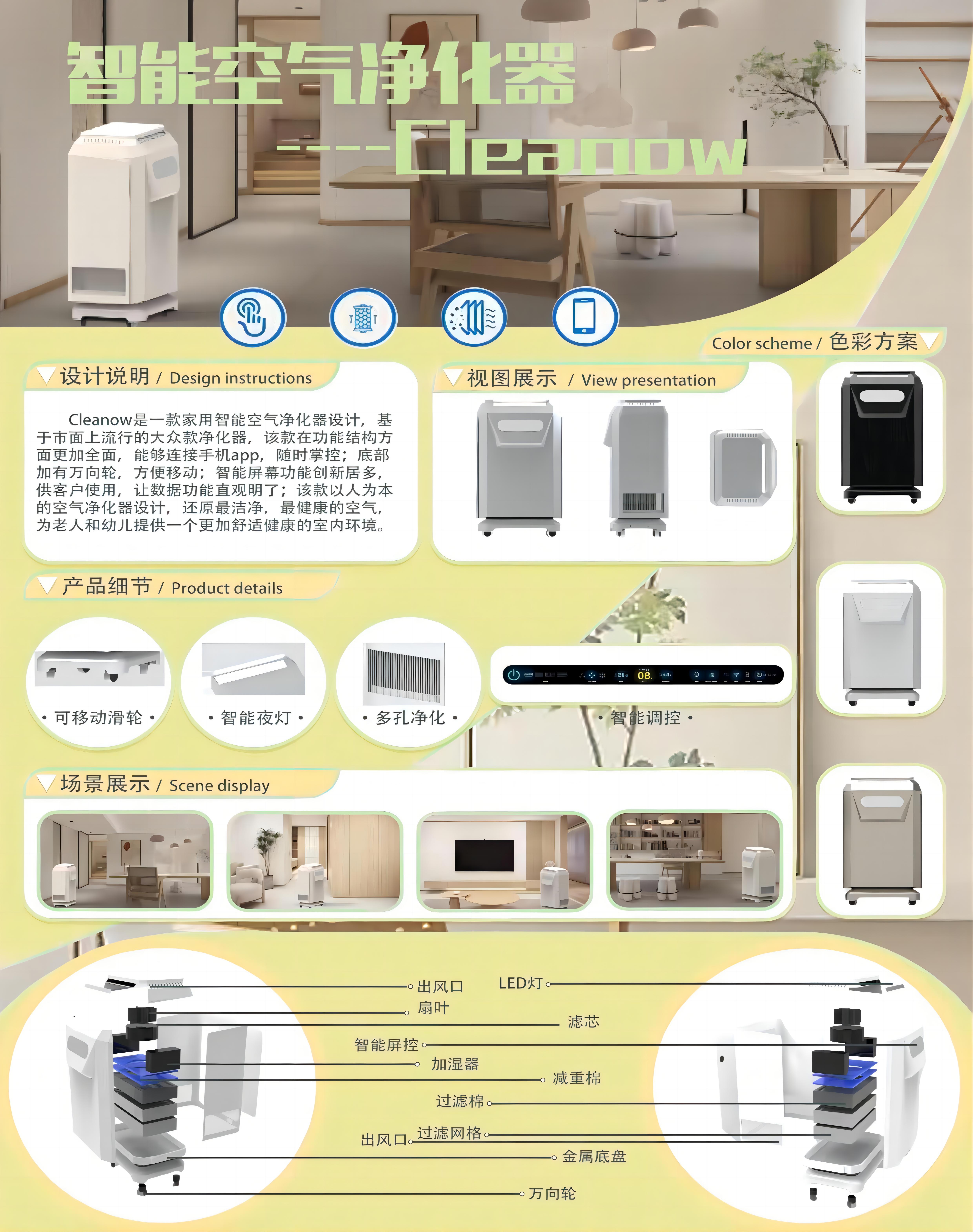 Cleanow是一款家用智能空气净化器设计,基于市面上流行的大众款净化器,该款在功能结构方面更加全面,能够连接手机app,随时掌控;底部加有万向轮,方便移动;智能屏幕功能创新居多,供容户使用,让数据功能直观明了;该款以人为本的空气净化器设计,还原最洁净,最健康的空气,为老人和幼儿提供一个更加舒适健康的室内环境。