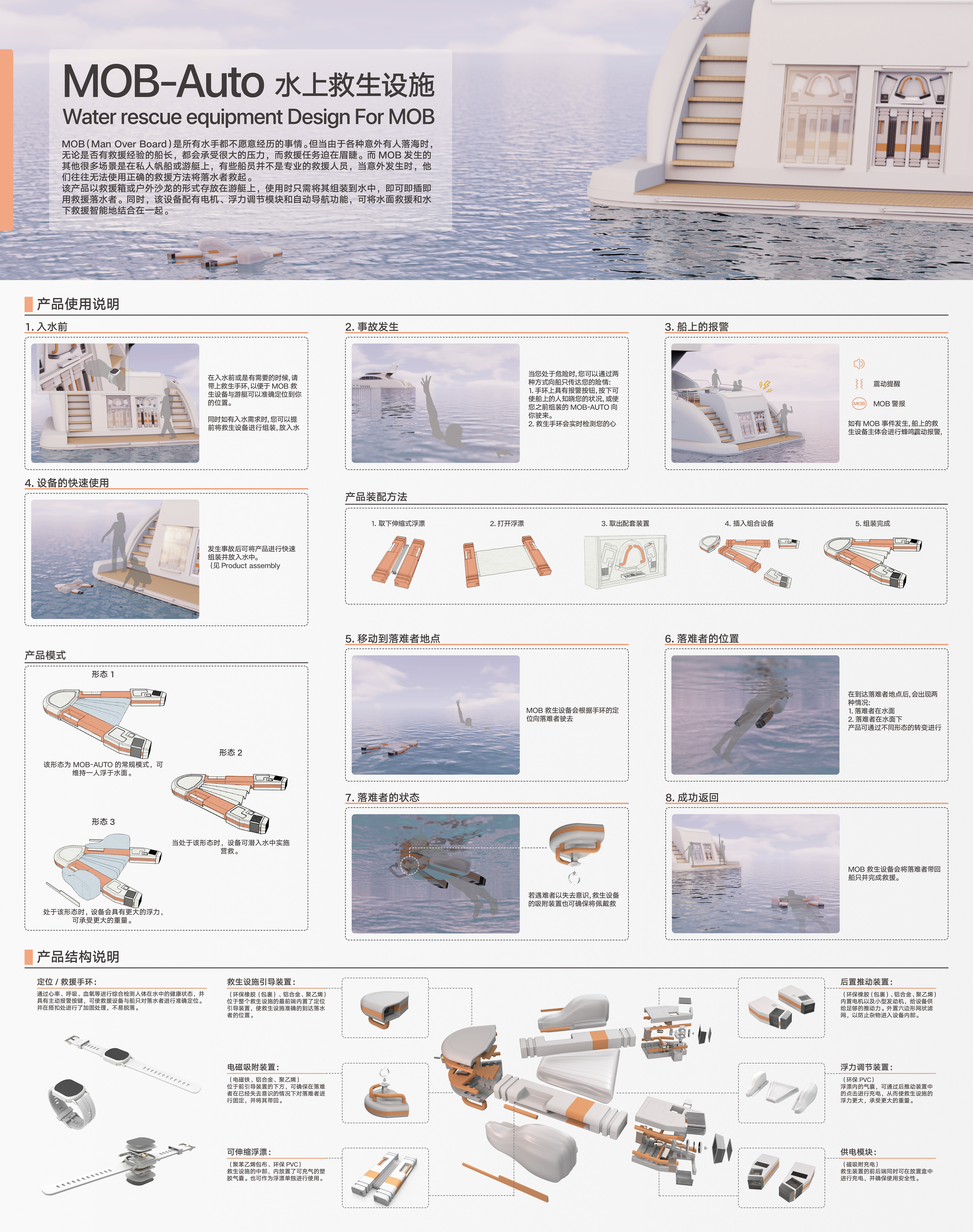 MOB-AUTO 水上救生设施为一款为解决MOB(Man Over Board)即船员落水情况的产品,该产品以救援箱或户外沙龙的形式存放在游艇上,使用时只需将其组装到水中,即可即插即用救援落水者。同时,该设备配有电机、浮力调节模块和自动导航功能,可将水面救援和水下救援智能地结合在一起。当此类紧急情况发生时,使用者可通过该产品快速安全的对落难者进行救援,有效的降低悲剧发生的概率。