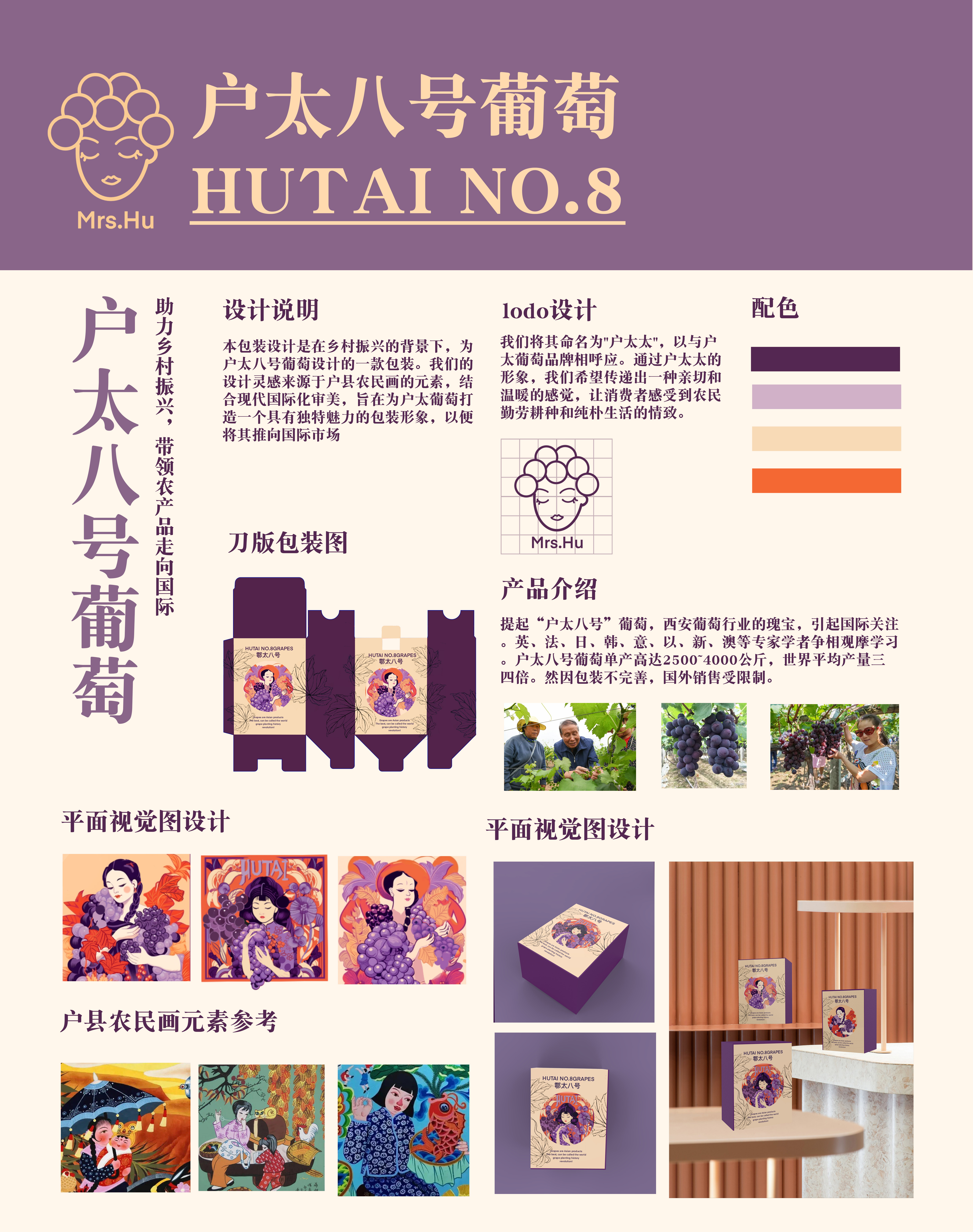 本包装设计是在乡村振兴的背景下,为户太八号葡萄设计的一款包装。我们的设计灵感来源于户县农民画的元素,结合现代国际化审美,旨在为户太葡萄打造一个具有独特魅力的包装形象,以便将其推向国际市场