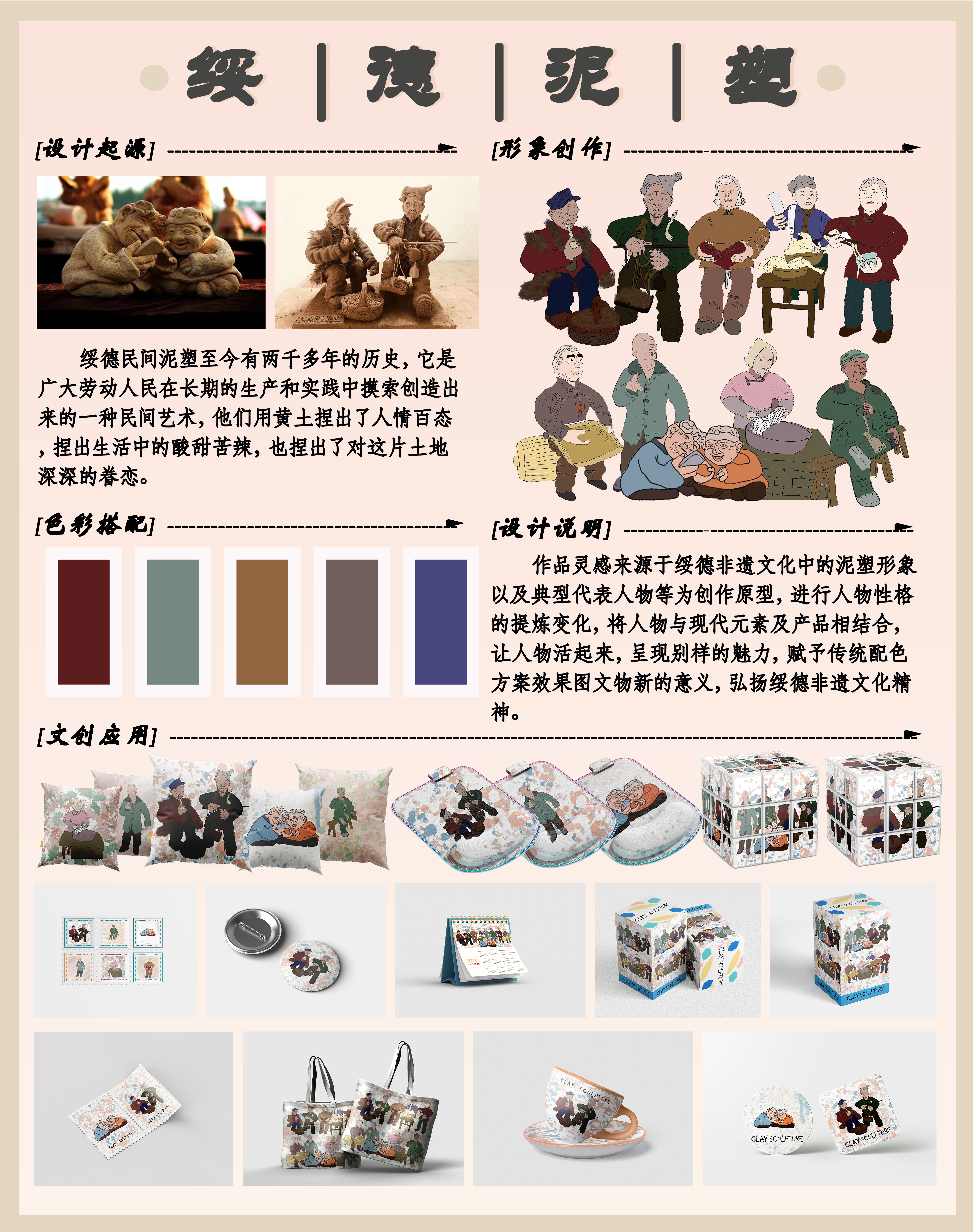 作品灵感来源于绥德非遗文化中的泥塑形象以及典型代表人物等为创作原型,进行人物性格的提炼变化,将人物与现代元素及产品相结合,让人物活起来,呈现别样的魅力,赋予传统配色方案效果图文物新的意义,弘扬绥德非遗文化精神。